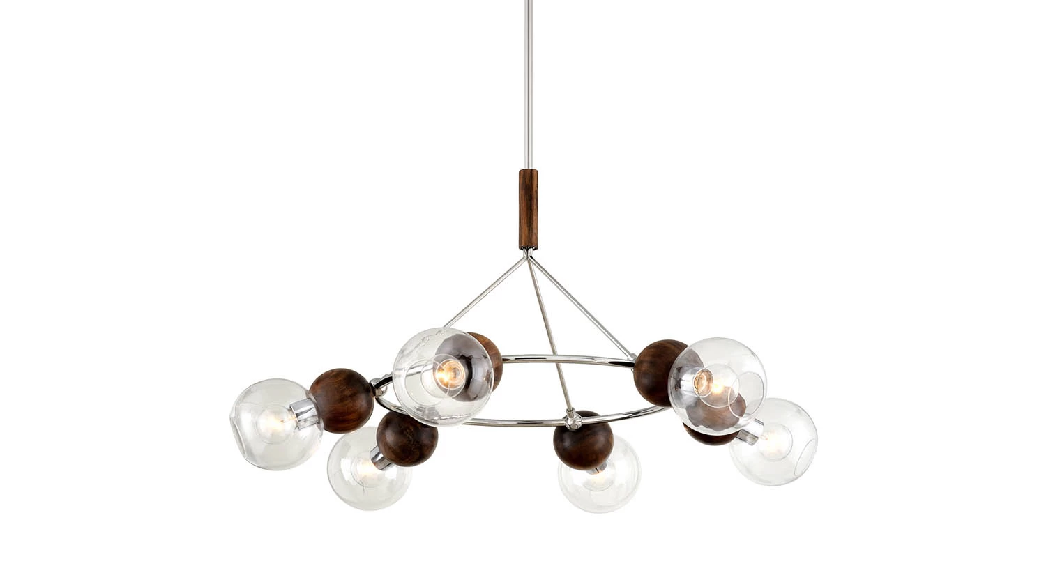 The Arlo Large Chandelier is distinguished by a tasteful blend of contrasting materials, creating a mid-century modern style. Six lights around its sleek, intriguing are covered by orb-like shades to give the home a beautiful ambiance.