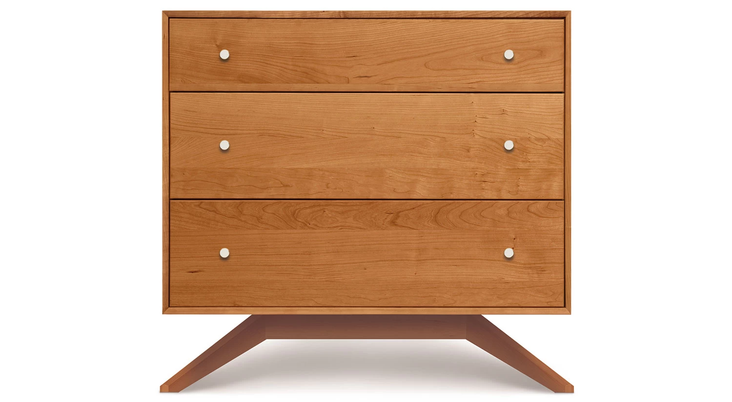 The Astrid 3 Drawer Dresser from Copeland is supported by four low-angle legs, which create a dramatic look and mid-century feel.