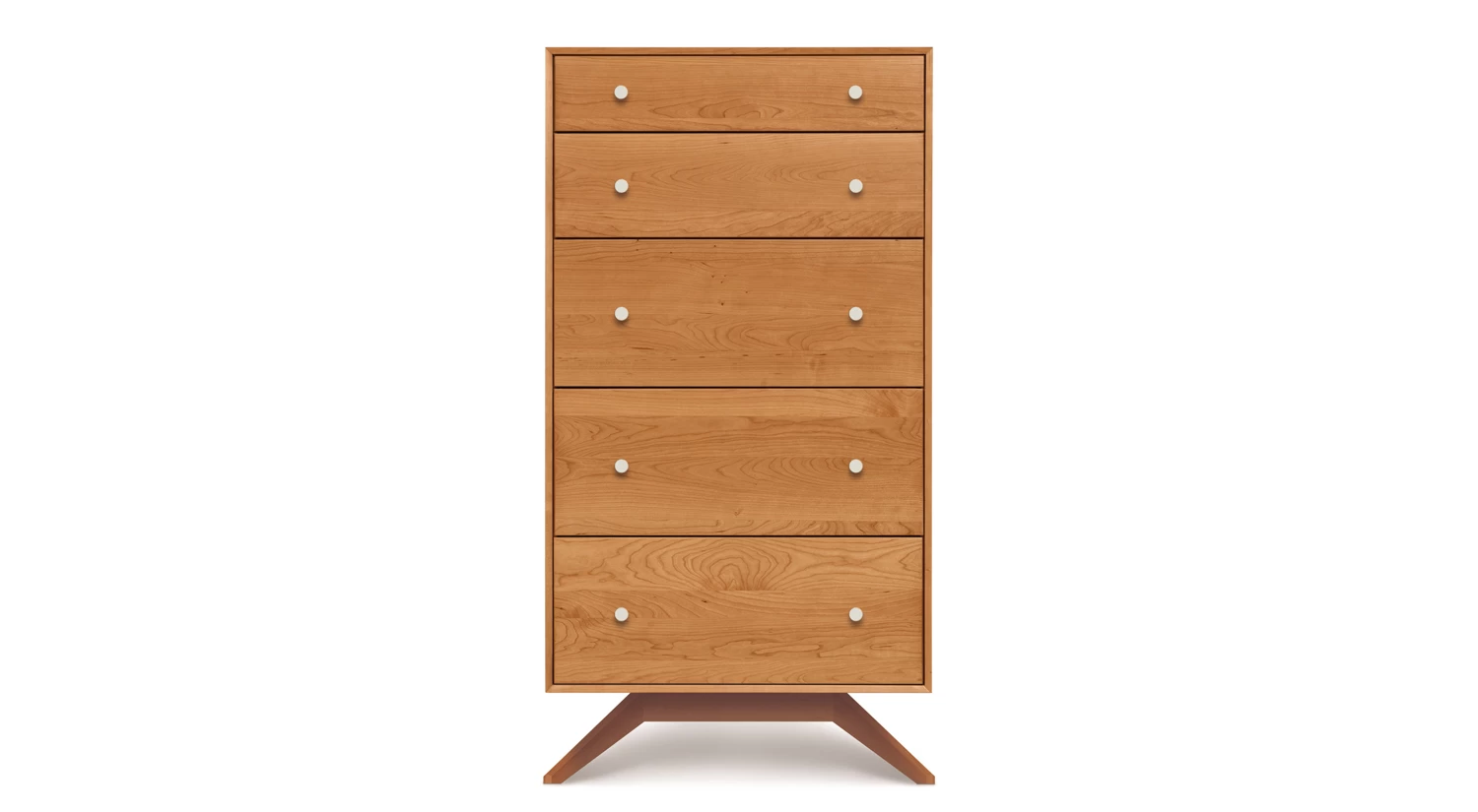 The Astrid 5 Drawer Chest from Copeland is supported by four low-angle legs, which create a dramatic look and mid-century feel.