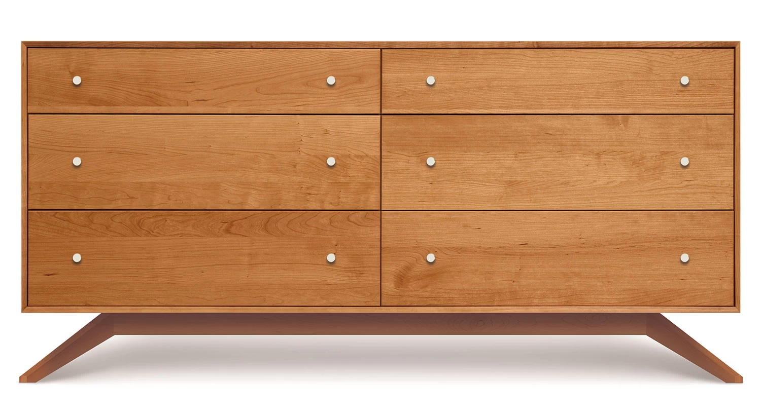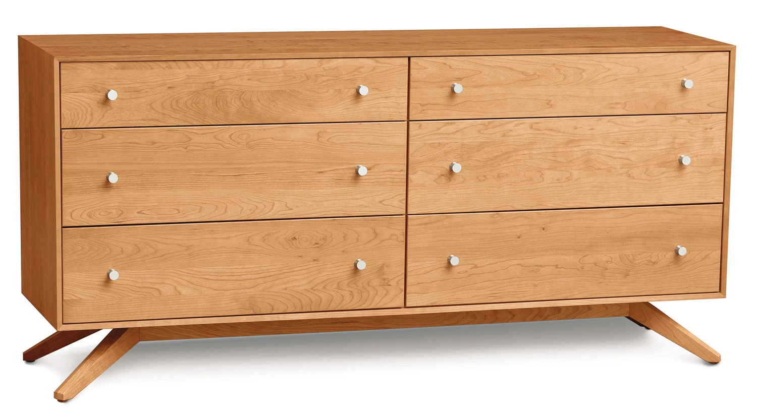 The Astrid 6 Drawer Dresser from Copeland is supported by four low-angle legs, which create a dramatic look and mid-century feel.