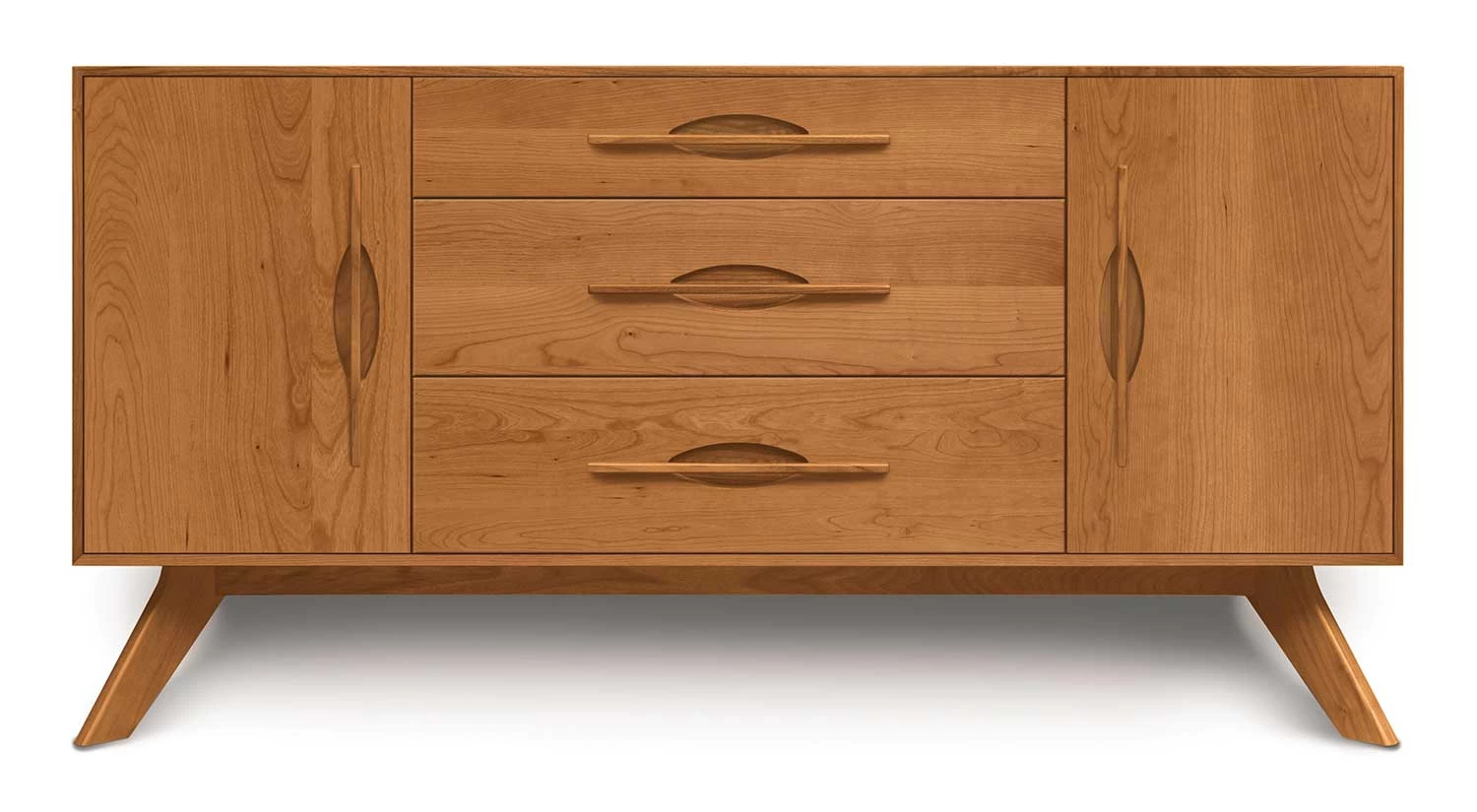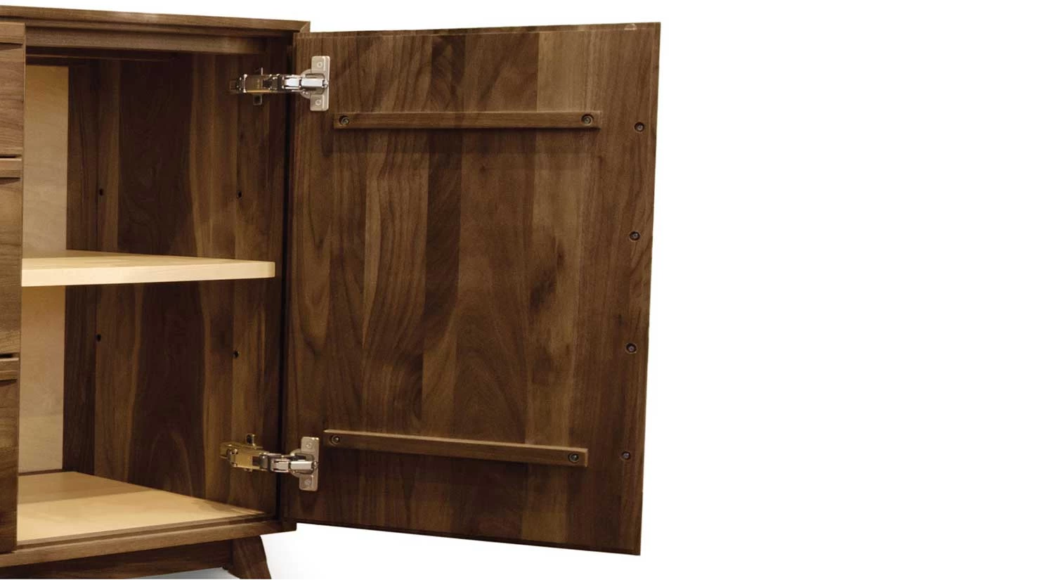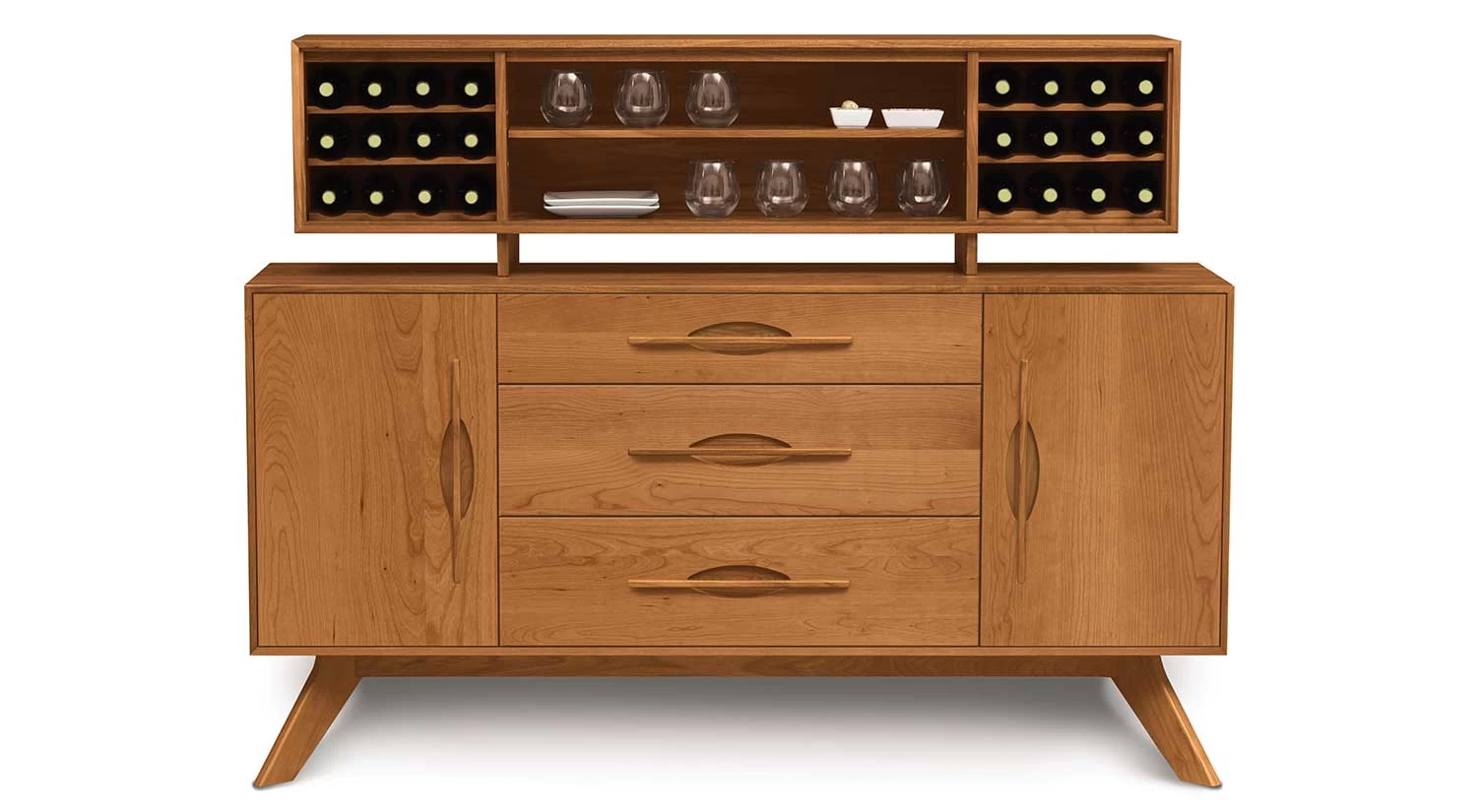 The Audrey Buffet offers three drawers of storage and two cabinets. The optional hutch incorporates adjustable or removable shelves for wine bottle storage. Available in solid cherry or walnut and a variety of cherry finishes. The interior of the walnut finish is in maple.