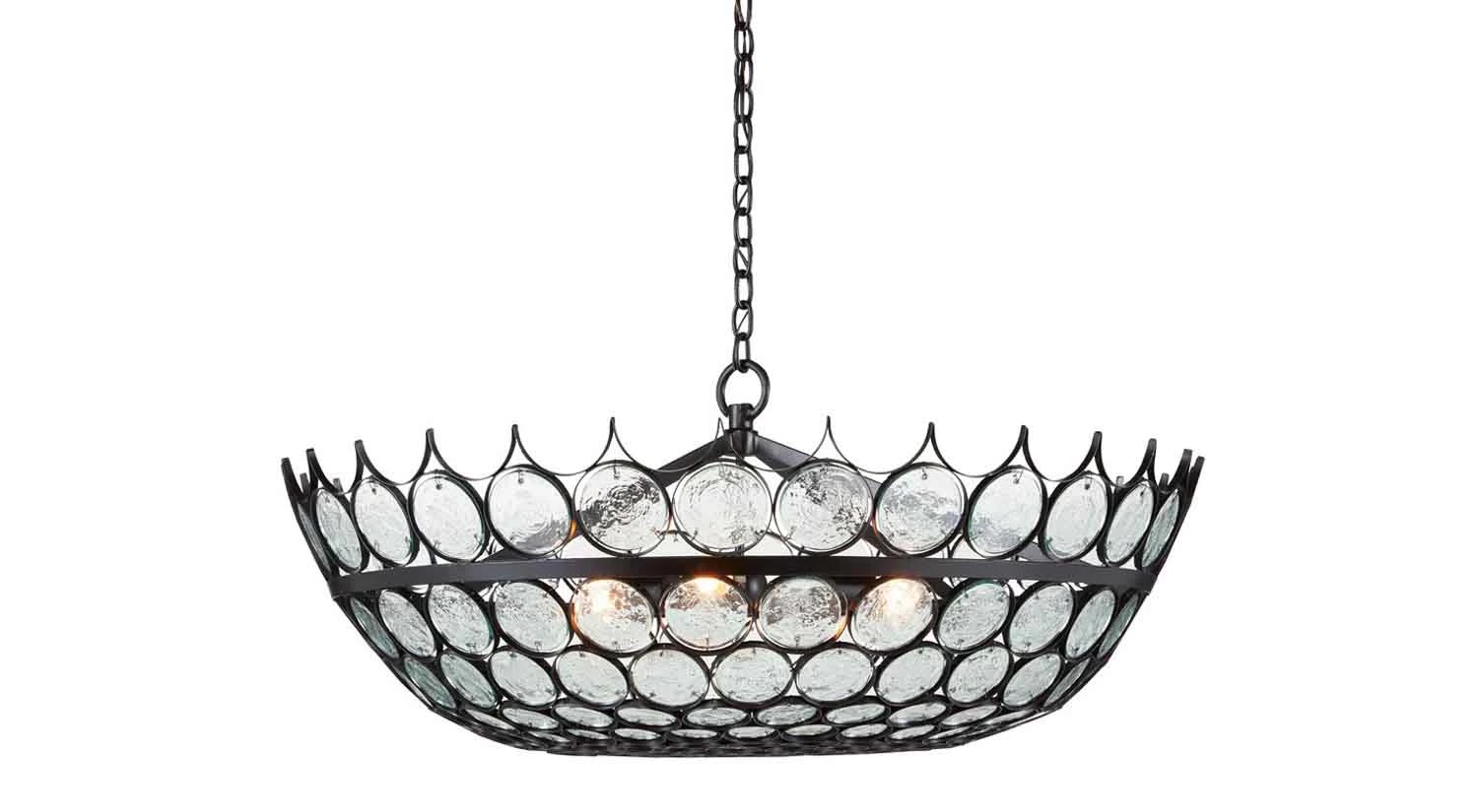 A piece as distinct and unique as the Augustus Chandelier will add a layer of pizazz to your home’s living space, foyer, or dining room. Recycled glass discs encased in wrought iron are arranged to create a crown-like fixture that’s captivating from any angle.
