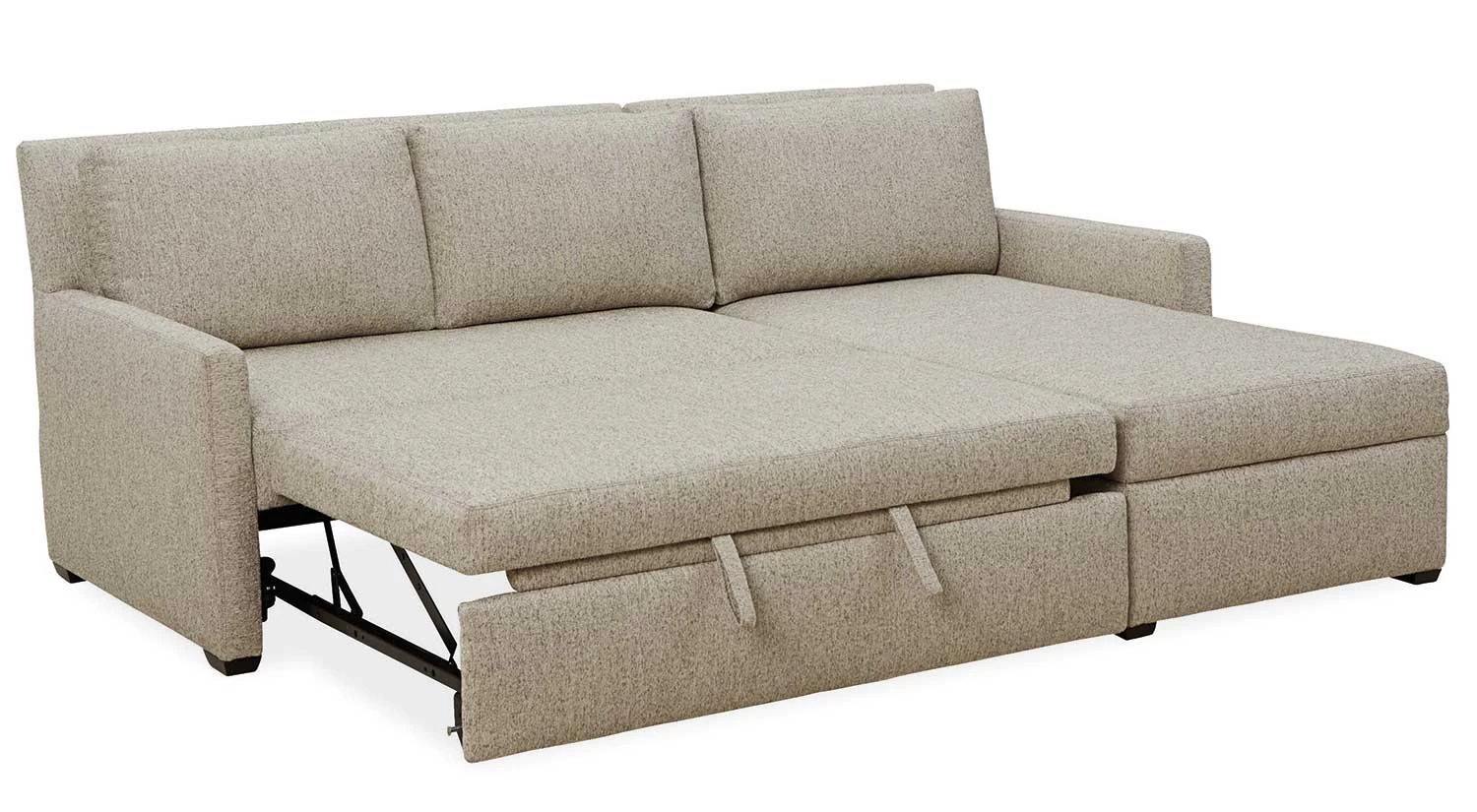 Our Austin Sleeper is full of options. The sleeper easily stows underneath the sofa and pops up to create a chaise lounge, queen sleeping surface, or a separate trundle bed.
