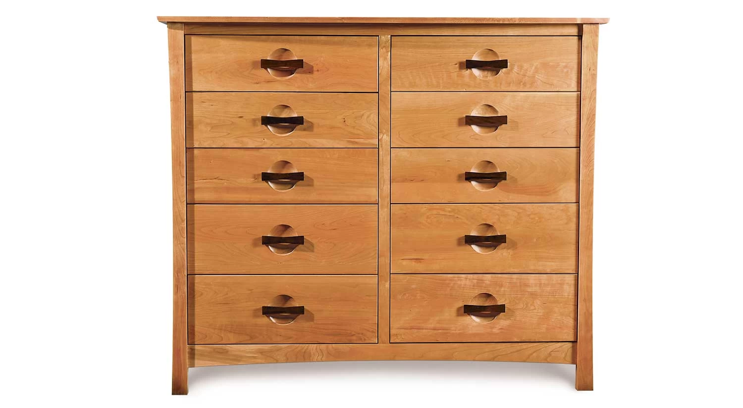 The Berkeley 10 Drawer Chest is made of solid cherry hardwood featuring black walnut accents, wood-on-wood drawer glides, and cherry veneer on the sides. It’s elevated off the ground to give your space a clean look, and its distinct details complement a sleek design. This dresser comes in a variety of GREENGUARD Certified finishes for low chemical emissions.