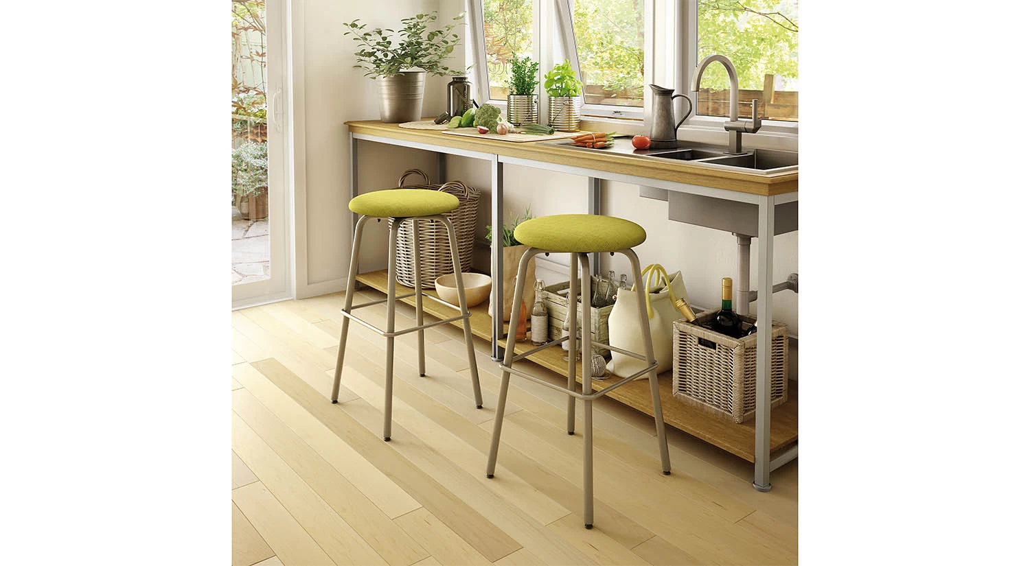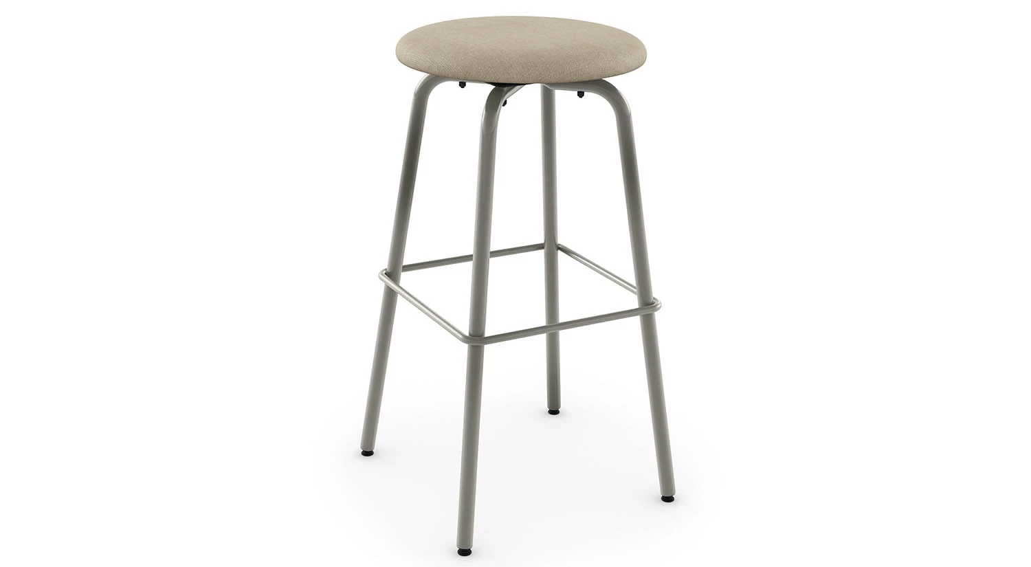 The Button stools by Amisco feature a modern look with metal legs and an upholstered seat.