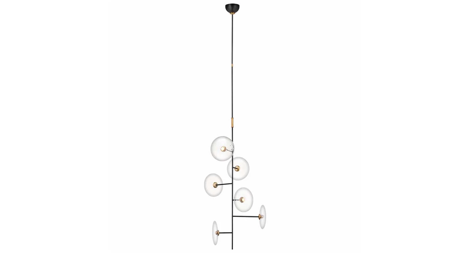 The Calvino Small Entry Chandelier will hang effortlessly in your home. Its six lights are topped with clear glass shades in contrast with an aged iron and antique brass finish to enhance a simple yet polished design.