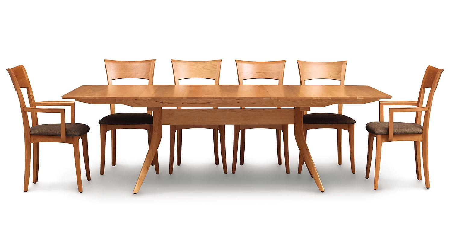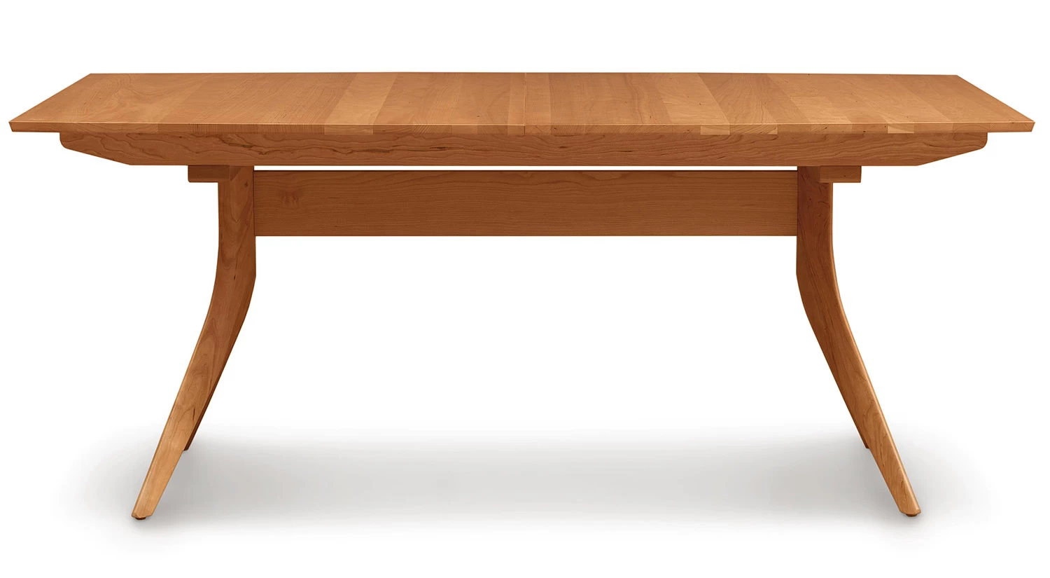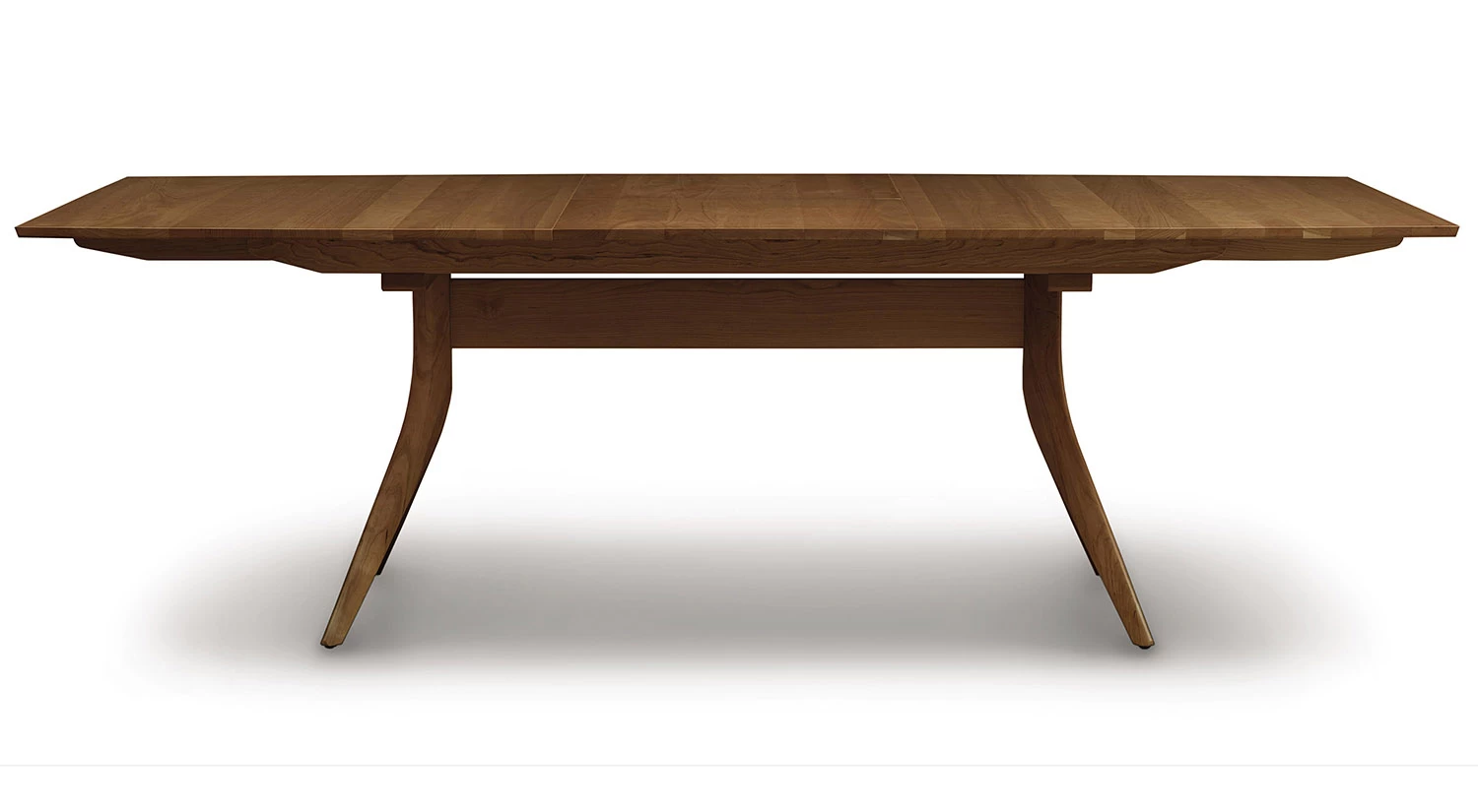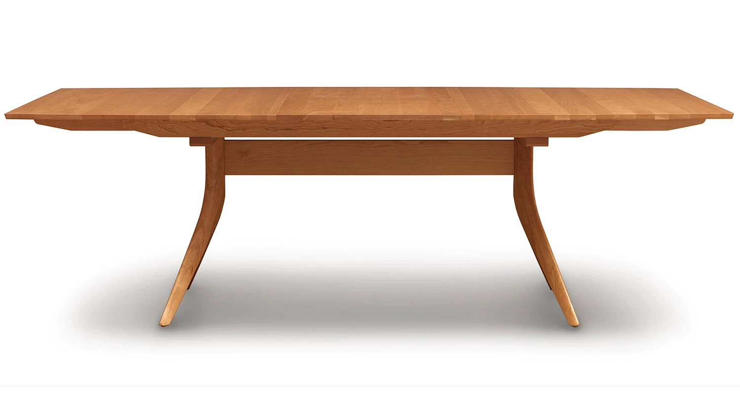 The Catalina Trestle Extension Table by Copeland is handcrafted from solid cherry or walnut in Vermont and features a clean mid-century modern style.