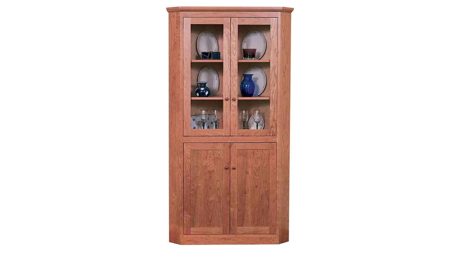 Shaker furniture is widely admired for its simplicity, innovative joinery, quality, and functionality. The Corner Cabinet is functional in its space saving shape and abundant storage capacity. Comes with two adjustable wood shelves, with plate grooves, in top section and one adjustable wood shelf in bottom section.