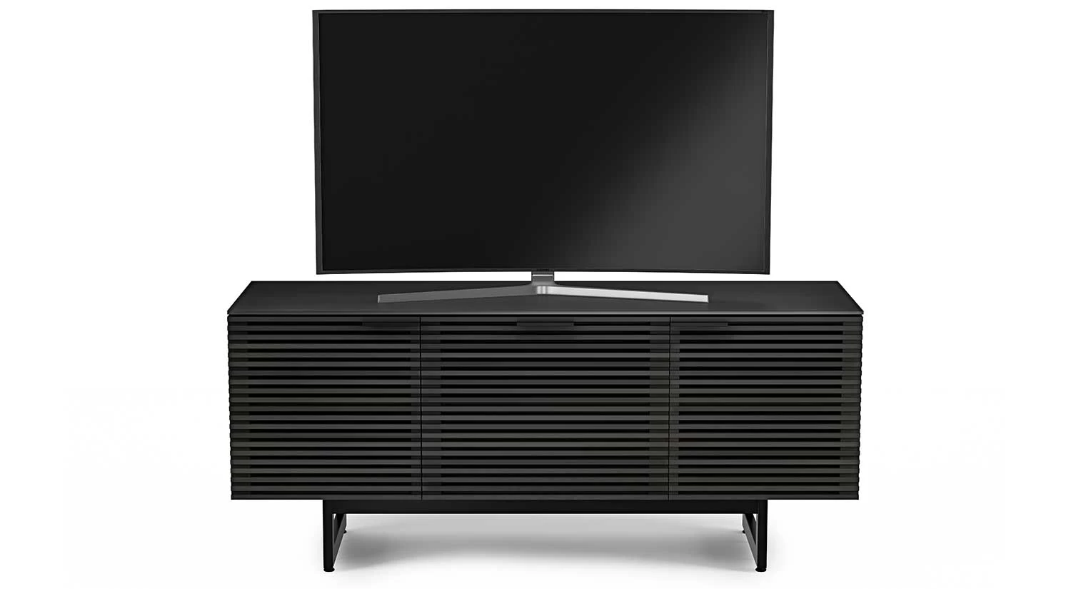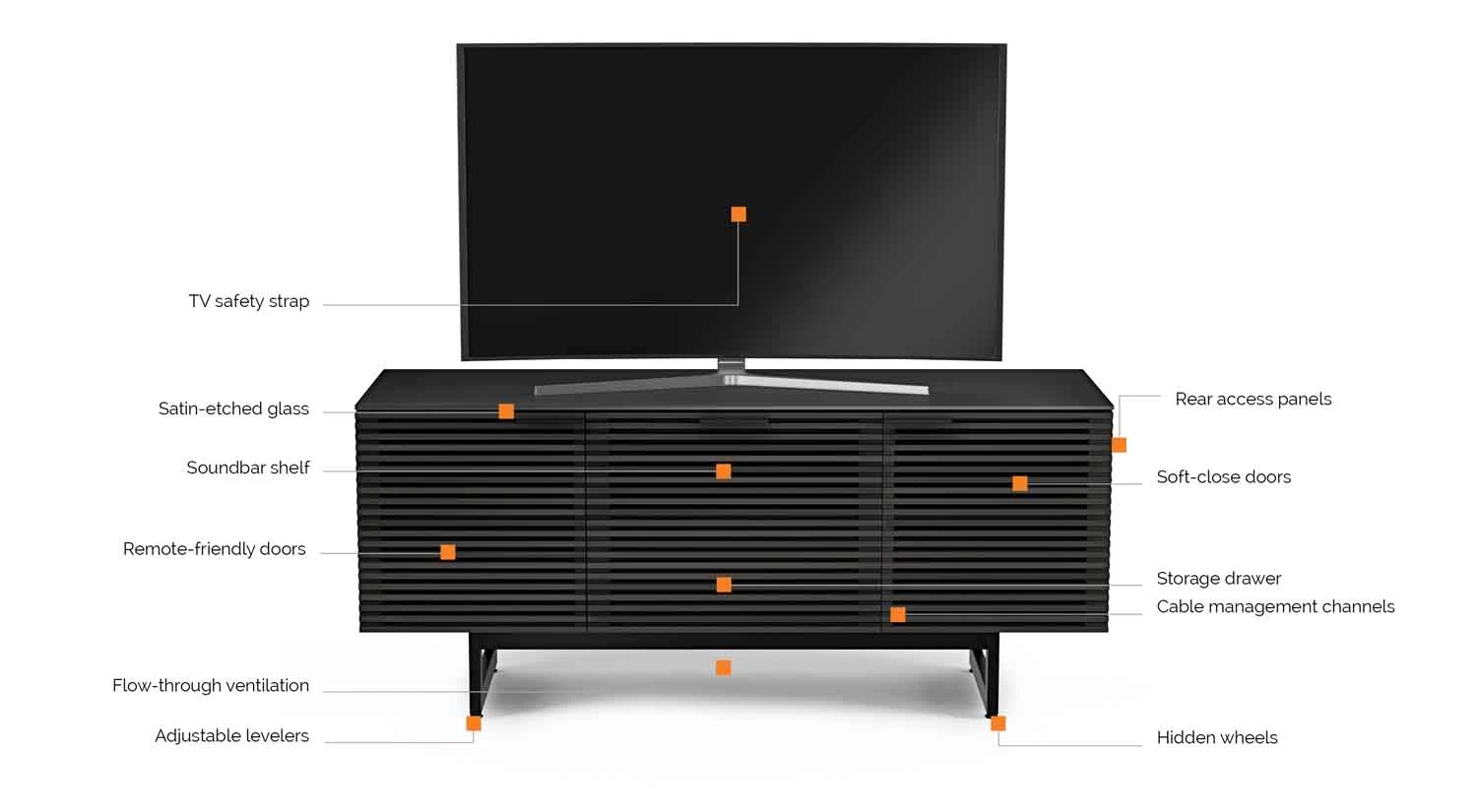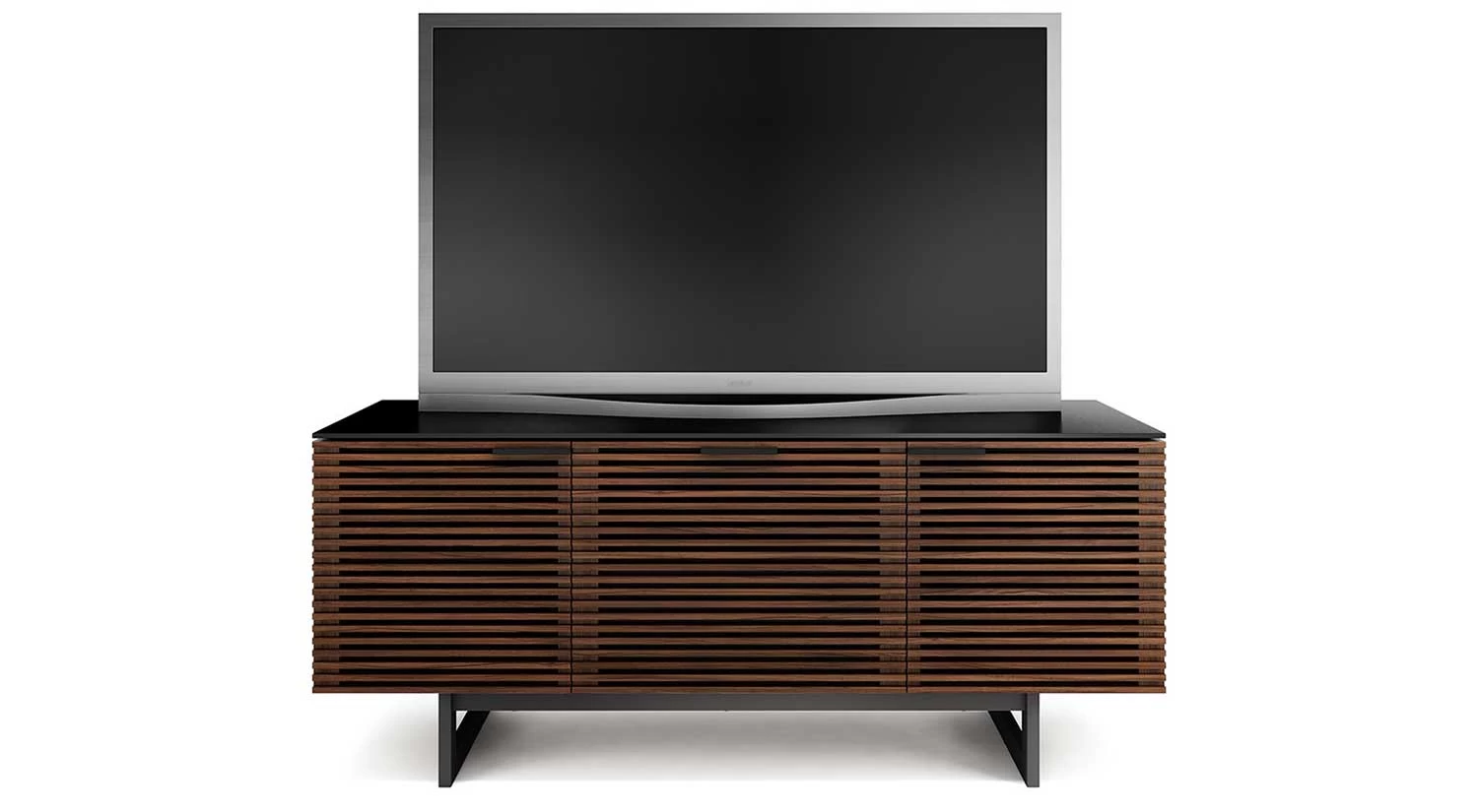 The Corridor 3 Door Media Console is a stylish, must-own entertainment center with an array of useful and innovative features. Hardwood louvered doors keep electronics neatly concealed but always accessible while a center drawer opens up to reveal a full-width soundbar shelf and media storage. A durable satin-etched tempered glass on top protects from dings, scratches, and fingerprints.