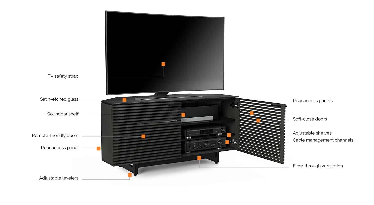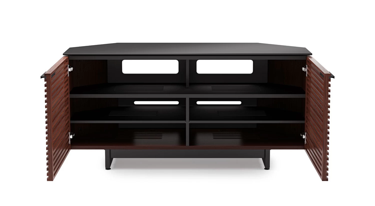 Whether up against a wall or nestled into a corner, the Corridor Corner Media Cabinet functions as a modern entertainment hub or storage space. Its louvered doors conceal an adjustable shelf while allowing sound or a remote control’s signal to pass through clearly. User-friendly features include a soundbar platform, integrated wire management, and a pre-installed safety strap that tethers your television to the unit.