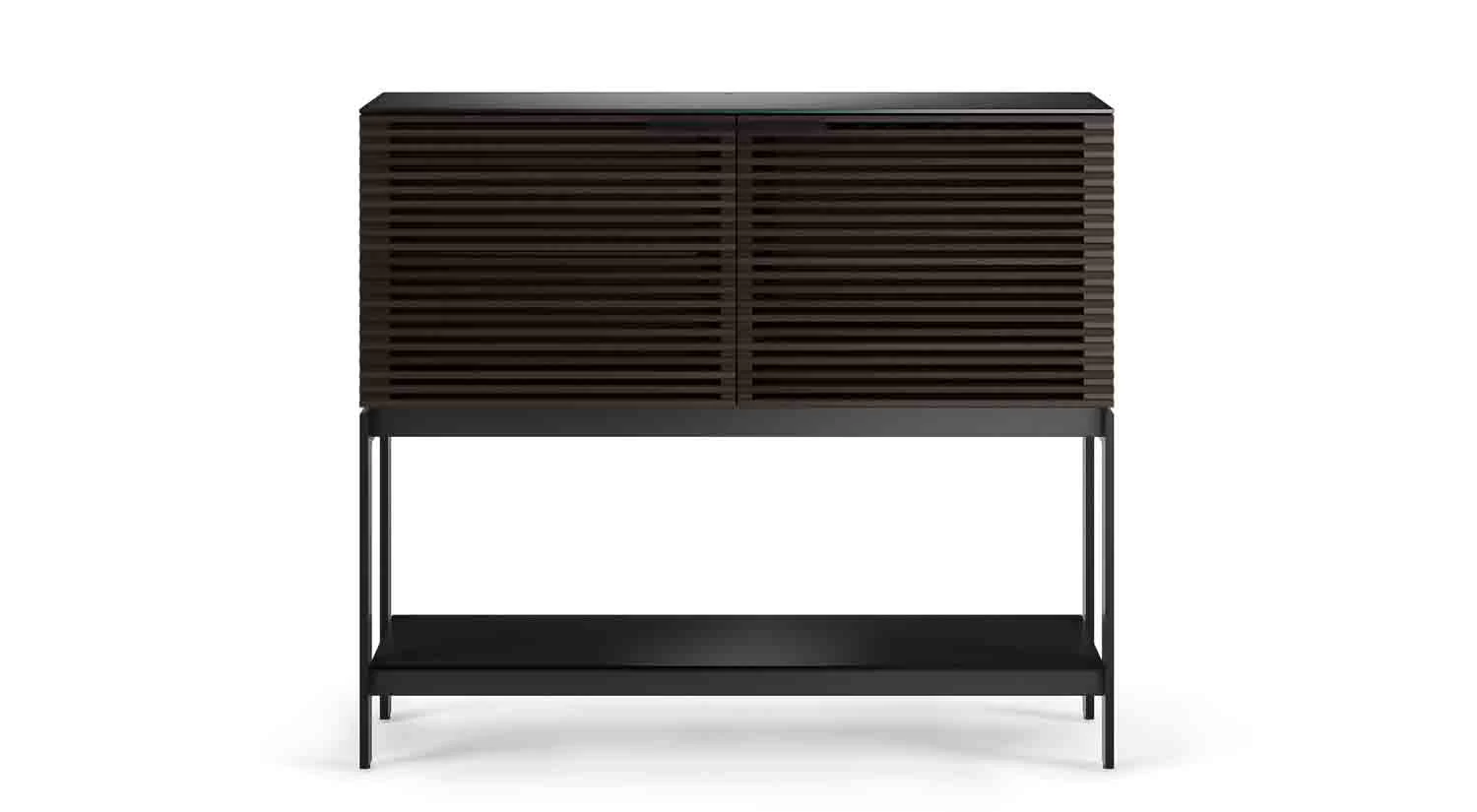 The Corridor Bar offers the perfect cocktail of style and function. Its double louvered doors conceal ample space for liquor, wine, and other essentials while a built-in stemware rack and other storage keeps glasses easily available. Highly durable black satin-etched glass provides protection from dings, scratches, and spills while mixing and serving.