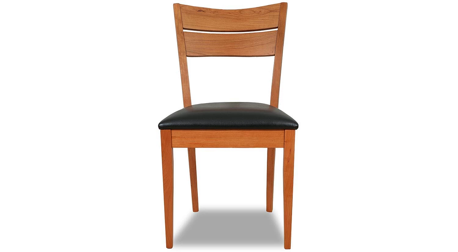 The Dalton chair is hand crafted from cherry or walnut. It features tapered legs and a black vinyl cushioned seat.