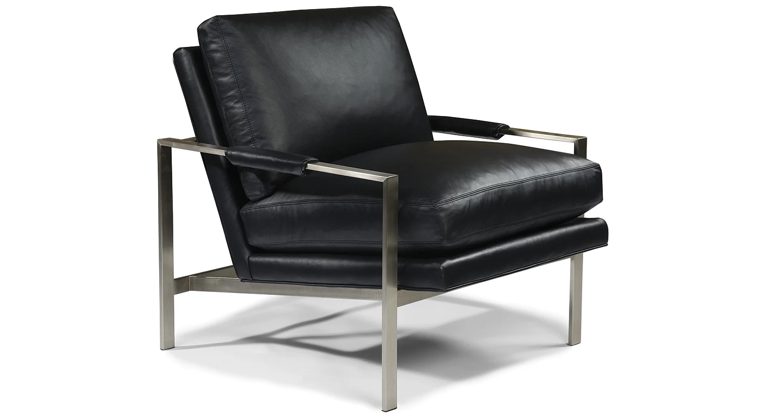 The Design Classic Chair by Thayer Coggin is a classic mid-century modern look. Originally designed in 1966, the chair lives on with an angled metal frame and timeless design.