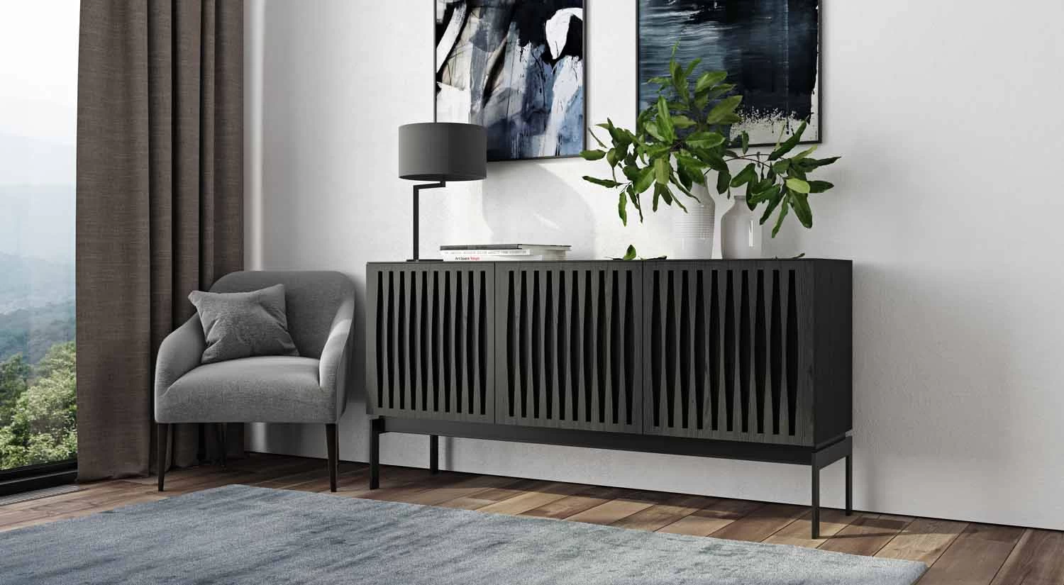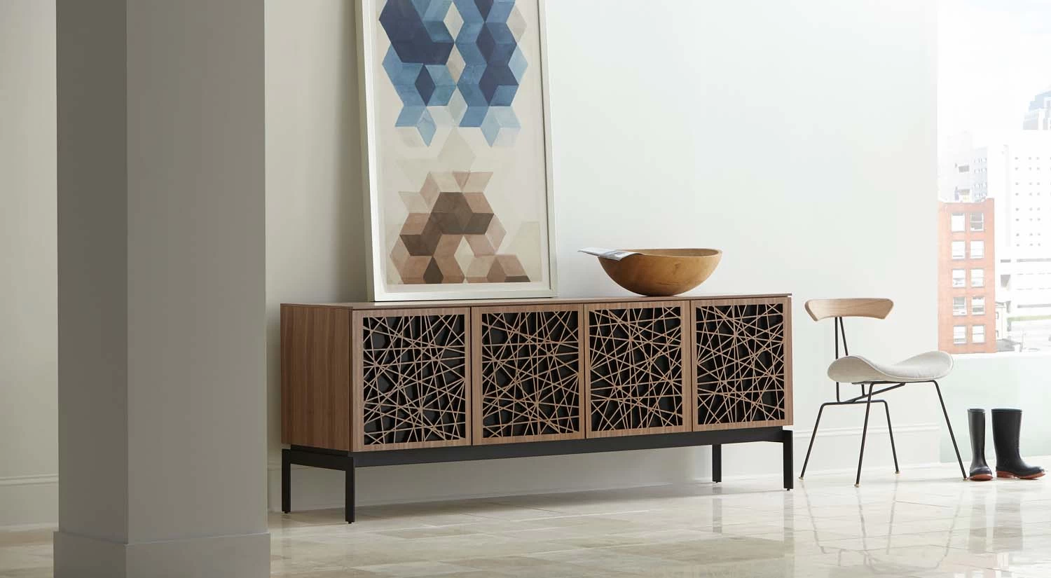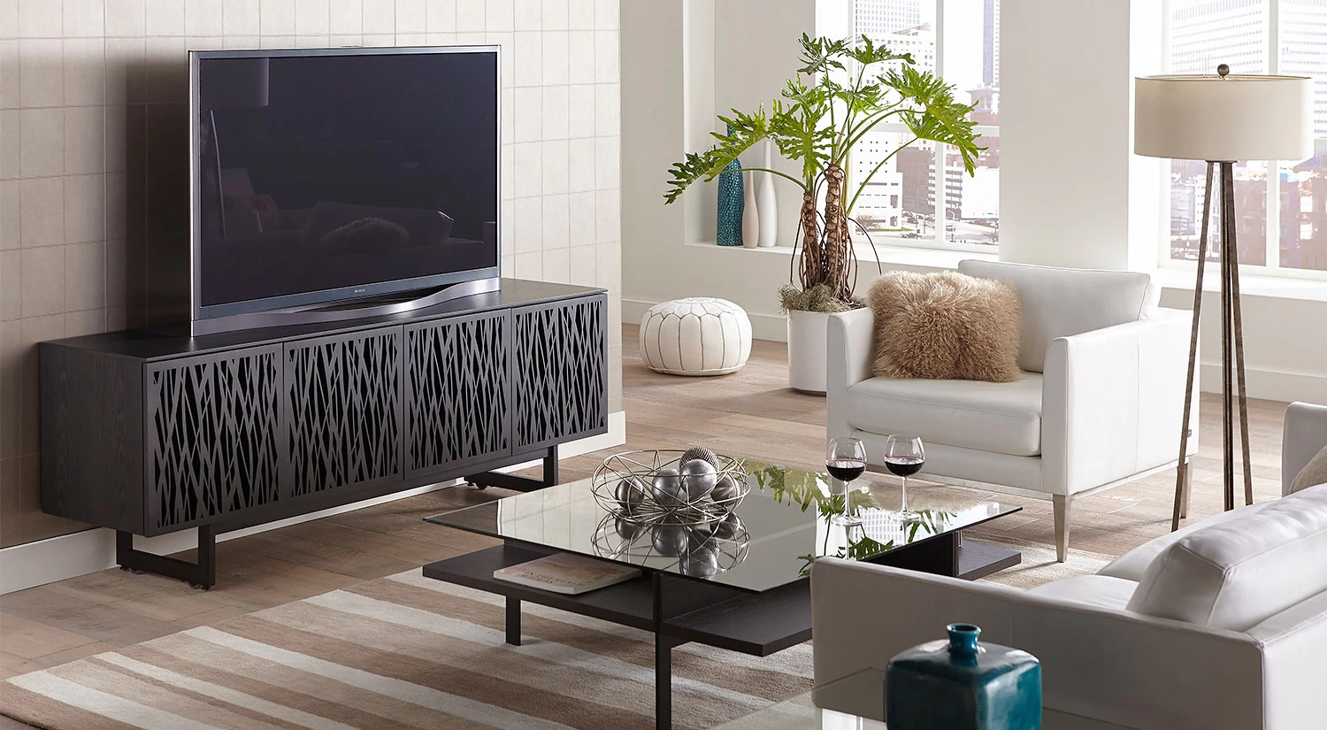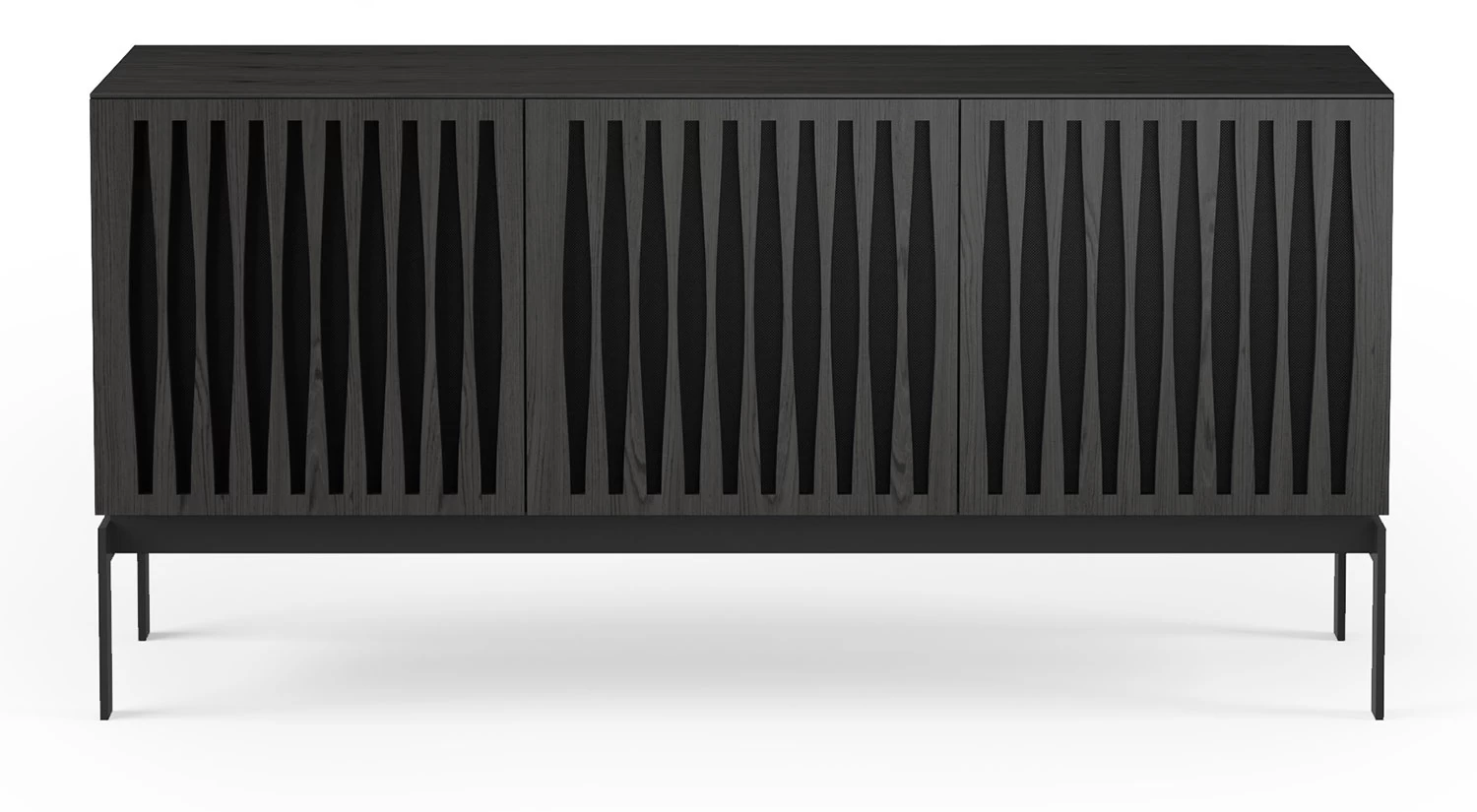 The Elements Media Console is the perfect modern storage solution for your living space. Doors showcase precise, intricate patterns and conceal contents inside the console while providing ventilation and remote control access. Hidden wheels in the base help this elegant piece maintain a low profile and integrated wire management keeps everything neat and tidy.