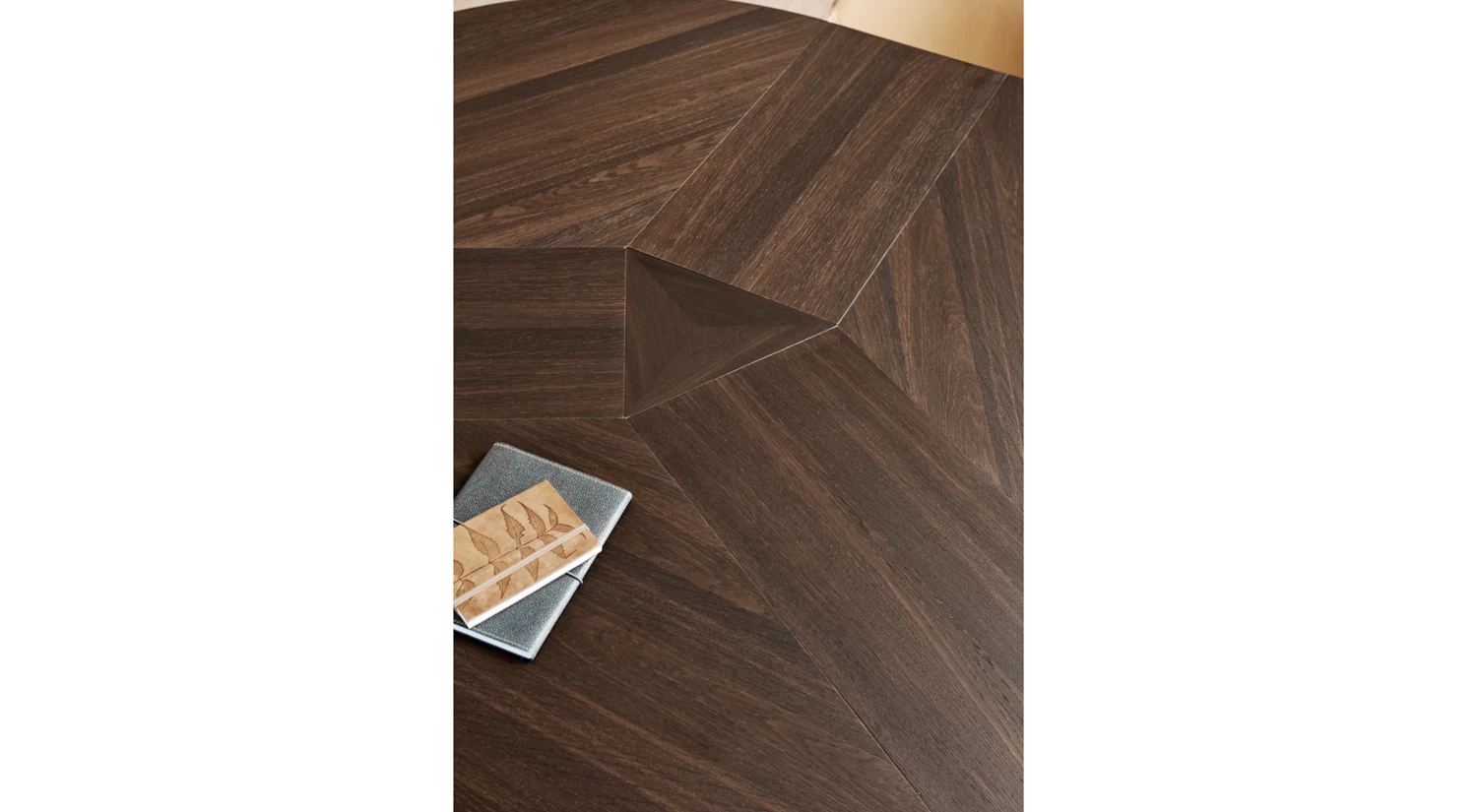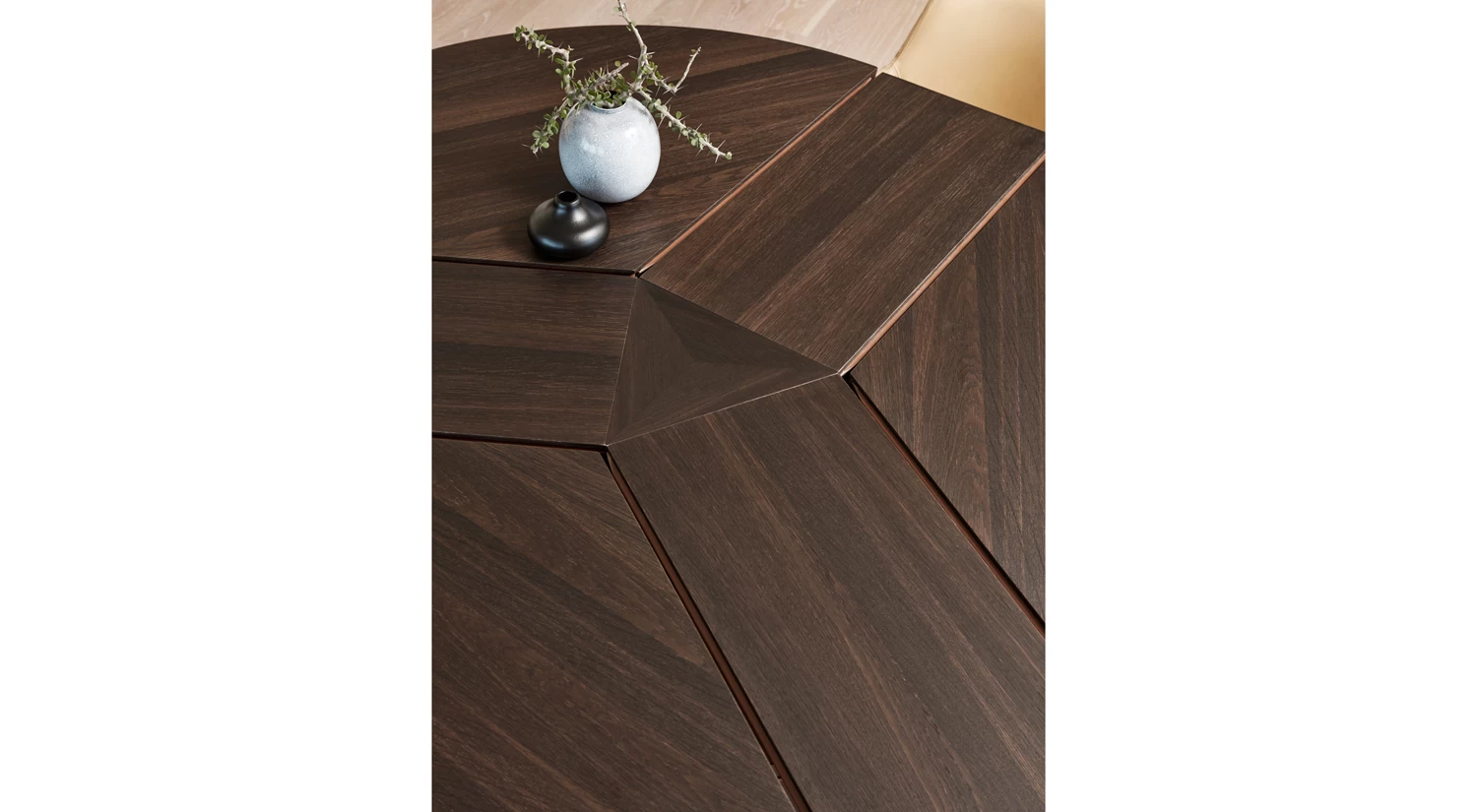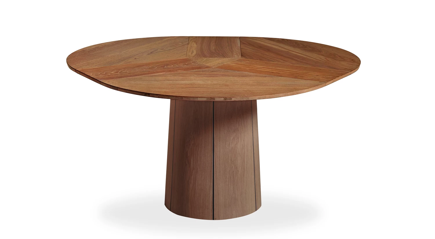 The Elsa Round DIning table is equipped with a unique extension system. By turning the turntable under the tabletop the three leaves move synchronously to a position that makes room for the extension leaves in the base. When light pressure is applied the extension leaves unfold by means of a spring placed under the triangle in the middle of the table.