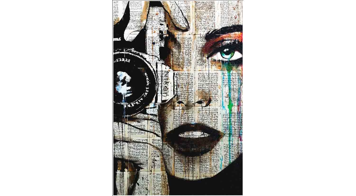 Eyes on You has a vintage feel, using stained book pages to display the face of a woman focused on capturing the perfect photograph.