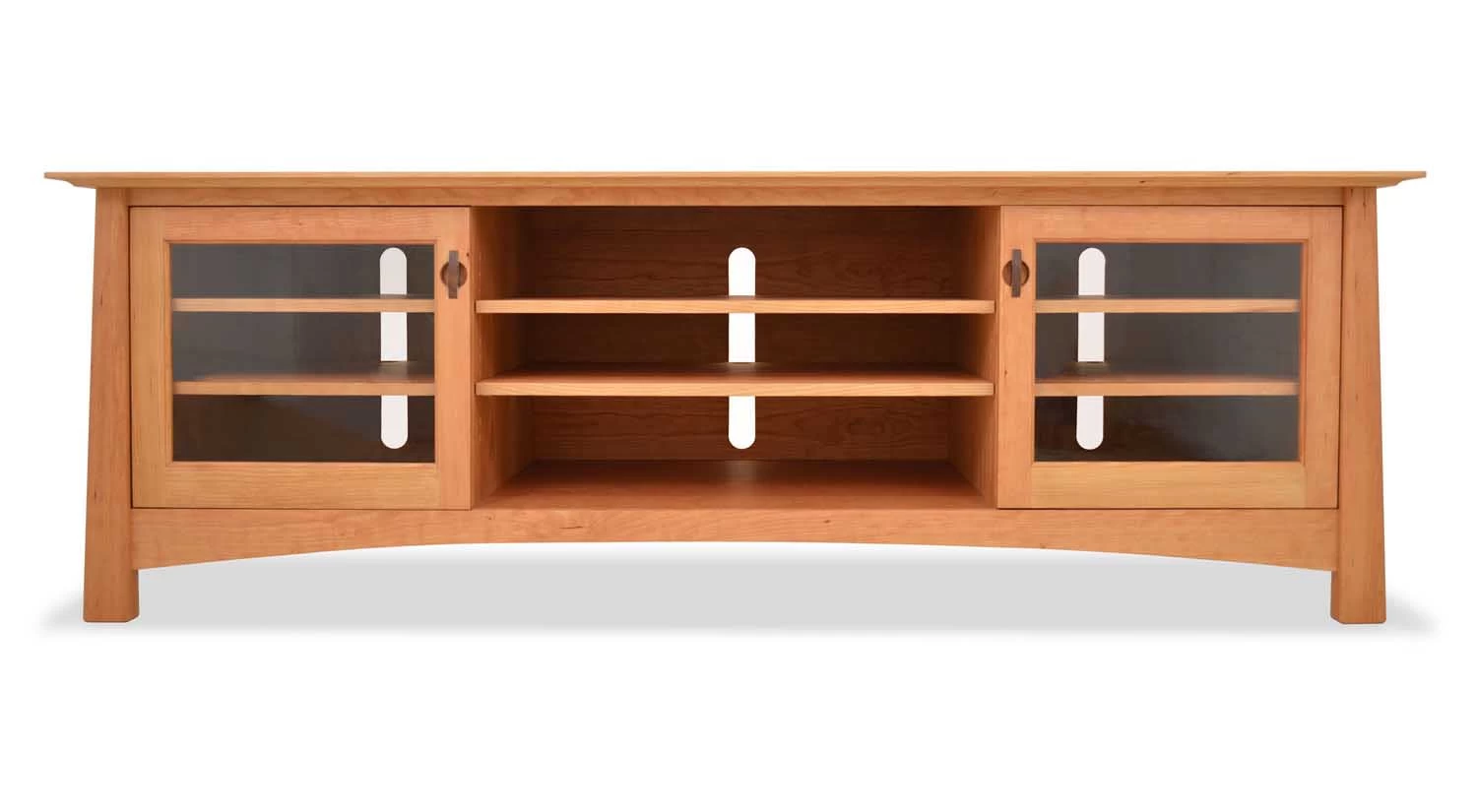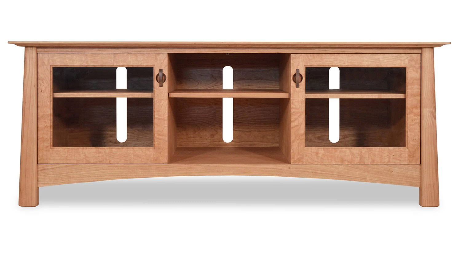 The Harvestmoon media console is handcrafted with solid wood. The pieces of cherry used in this piece are selected for beauty and consistency and finished in linseead oil. Each section has one fixed shelf and two adjustable shelves for component storage.