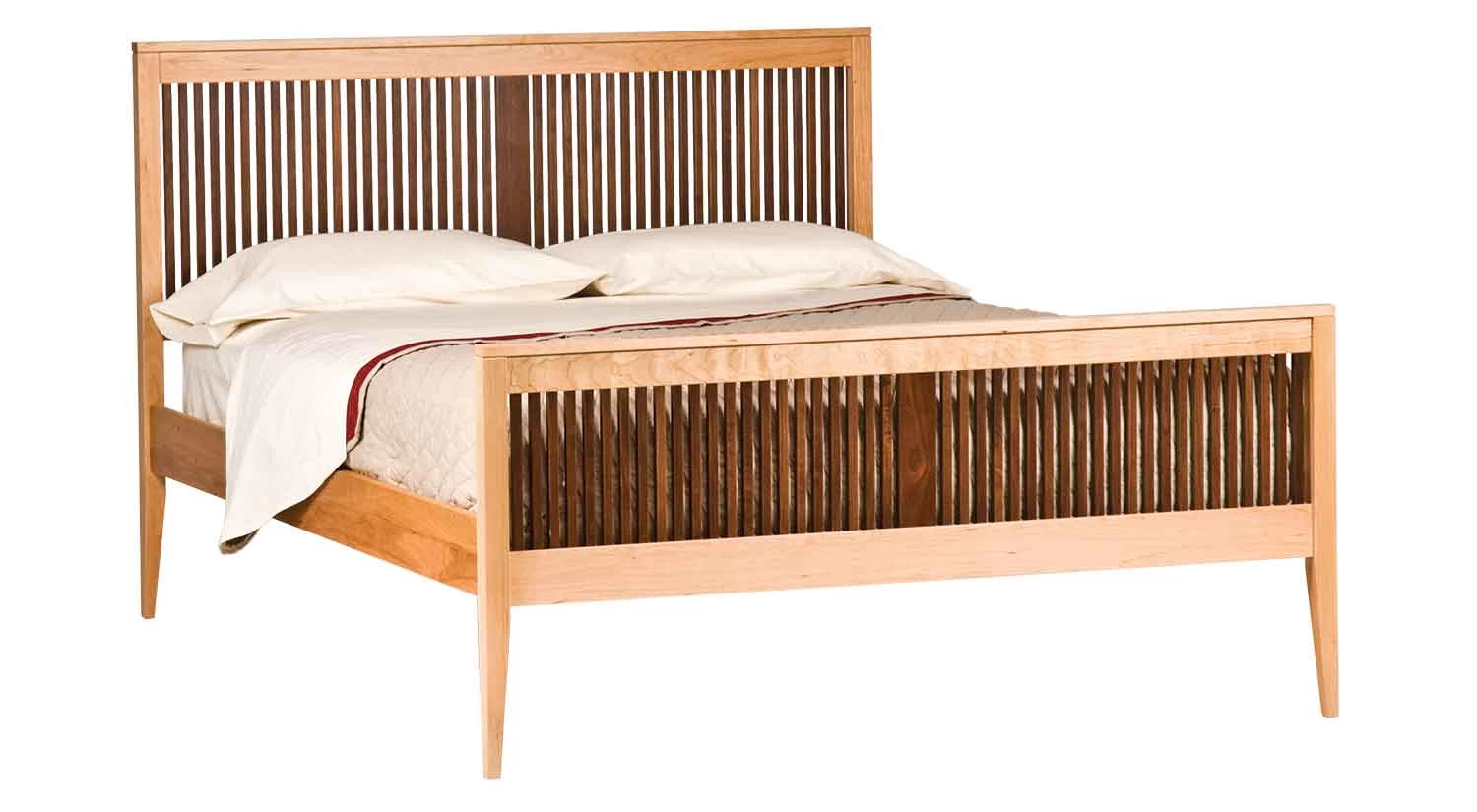 The Heritage Luna Bed from Woodforms is a timeless Shaker style and made right here in Massachusetts. Made from solid hardwood, it has lovely square walnut spindles that contrast beautifully with the cherry wood.