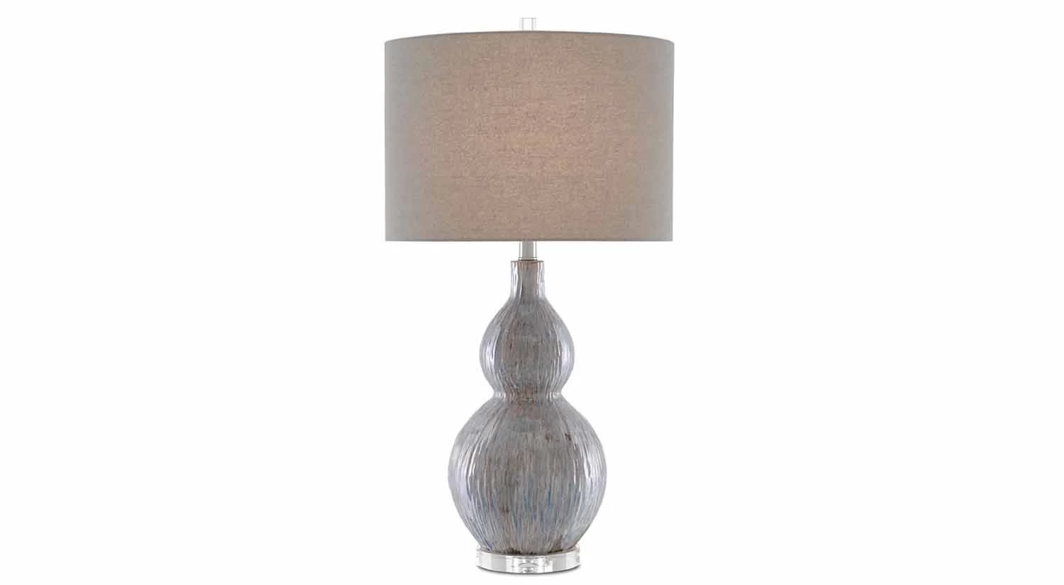 The Idyll Table Lamp stands on a clear crystal base, showing off its elegance. Its gourd-shaped body is made of porcelain with small grooves that add subtle texture. Soft neutrals mixed with blue give this lamp an aesthetically pleasing look.