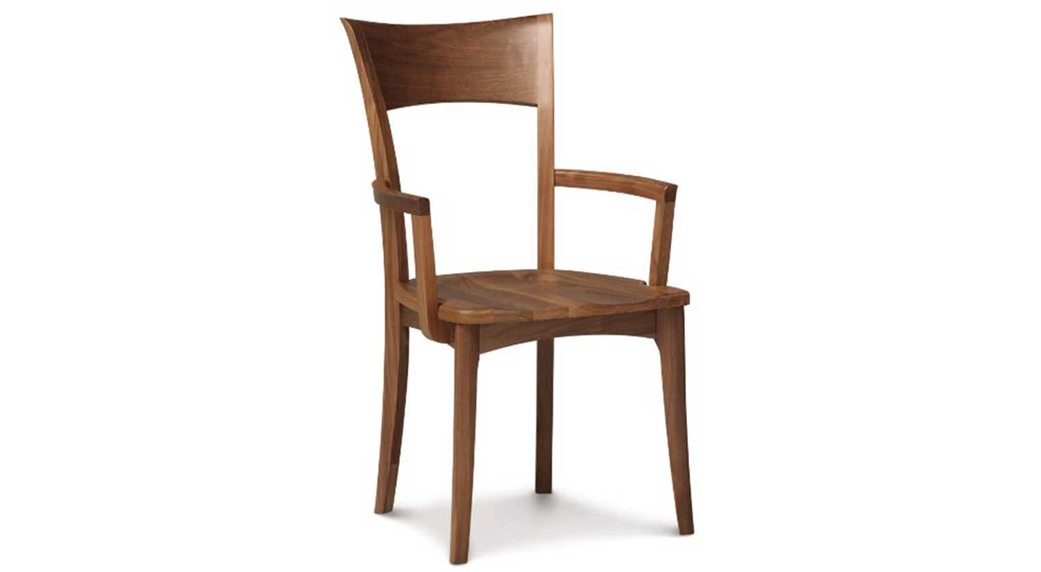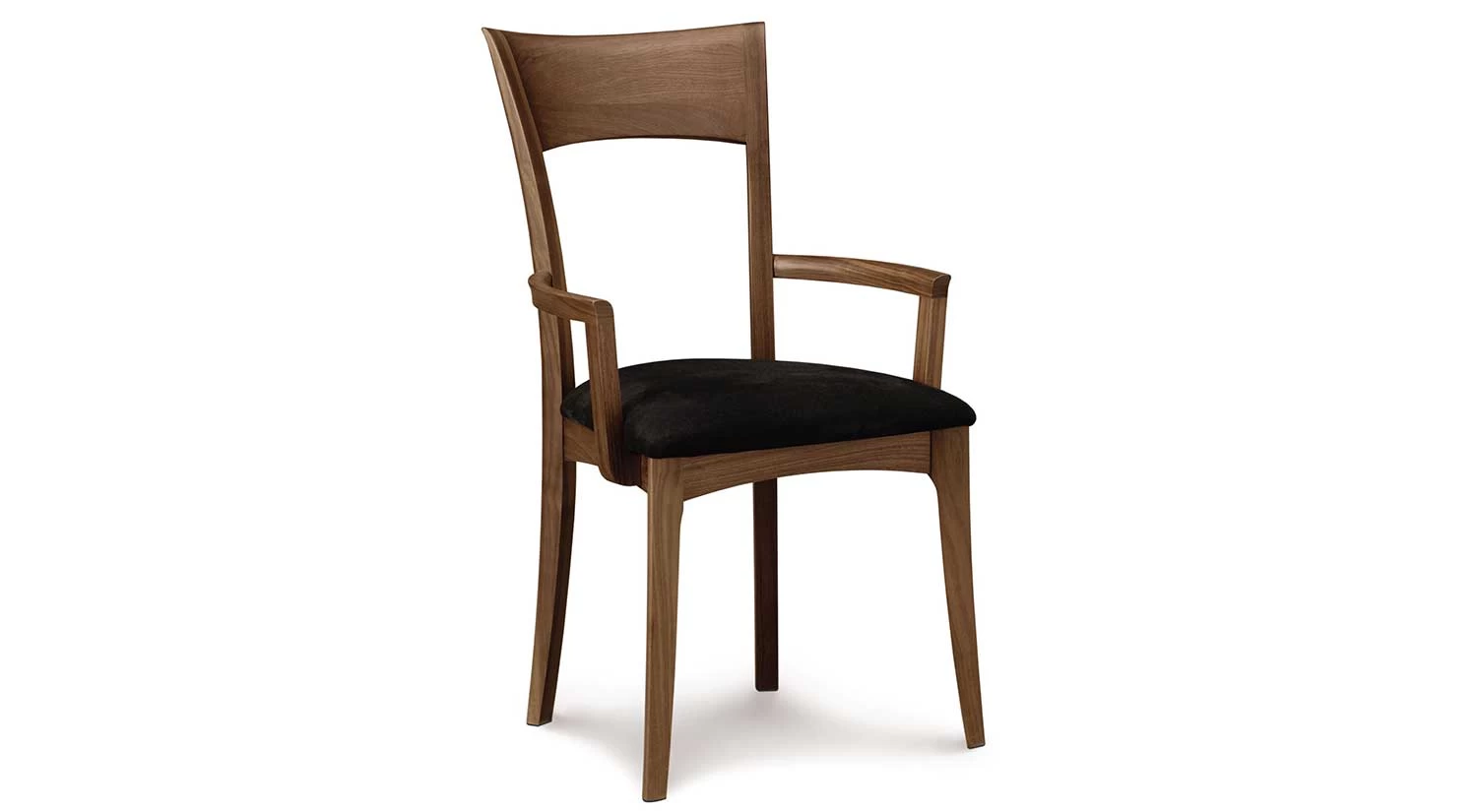 The Ingrid arm chair is made from solid cherry or black walnut wood. It is also available in a variety of finishes. The ingrid arm chair is also availble with a wood seat for an upcharge. More fabrics choices are available in store.