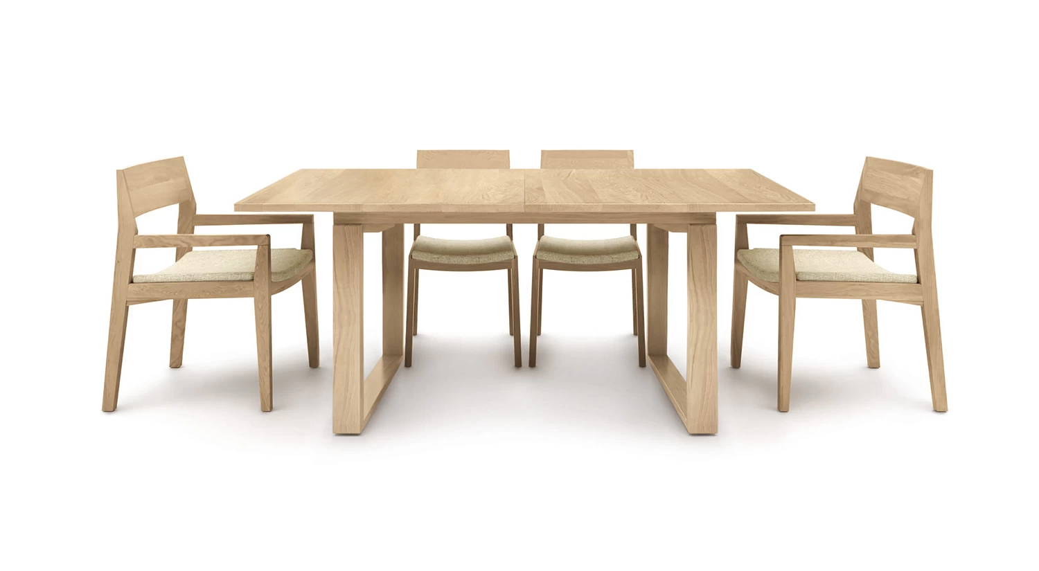The Iso Extension Top Dining Table from Copeland Furniture, made in Vermont from solid oak hardwood, incorporate self-equalizing, ball bearing extension glides and a single self-storing butterfly leaf for single handed operation.