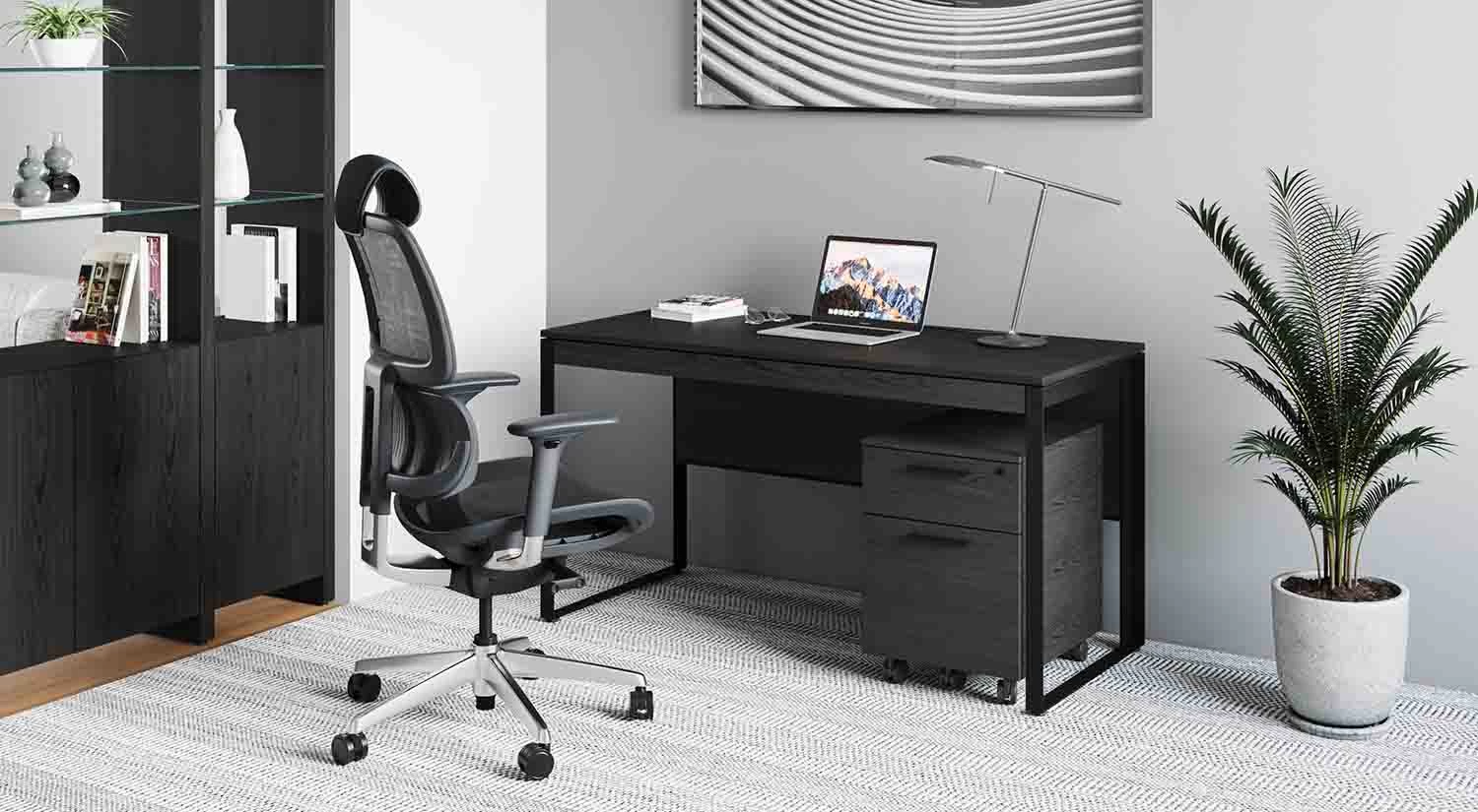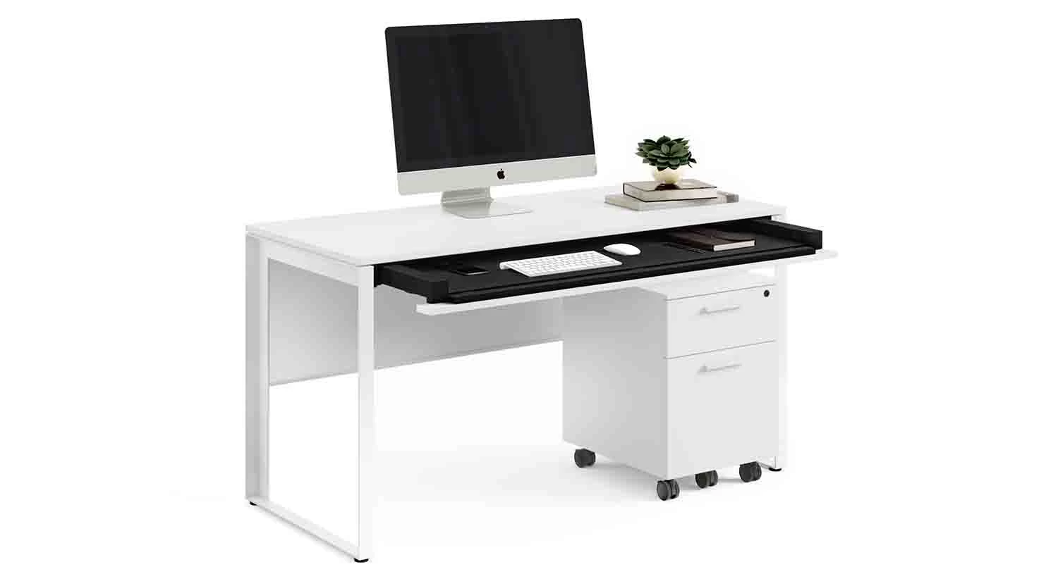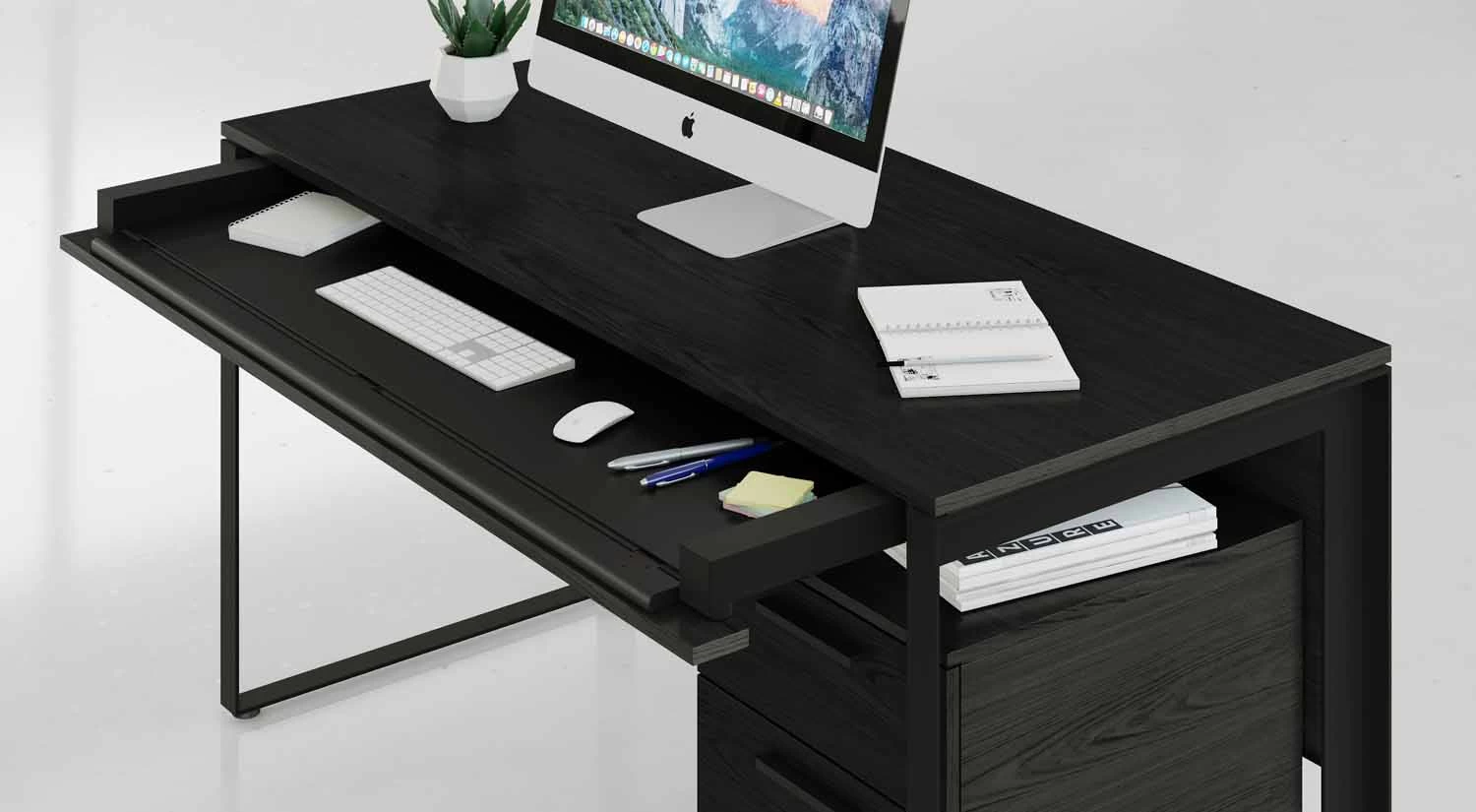 The Linea Desk has a modern, minimalist design. It features a generously sized wood top, cable management, and a full-width keyboard drawer to help maintain a clutter-free work area. If you need additional storage and organization, this desk pairs well with the Linea Mobile File for a uniform look.