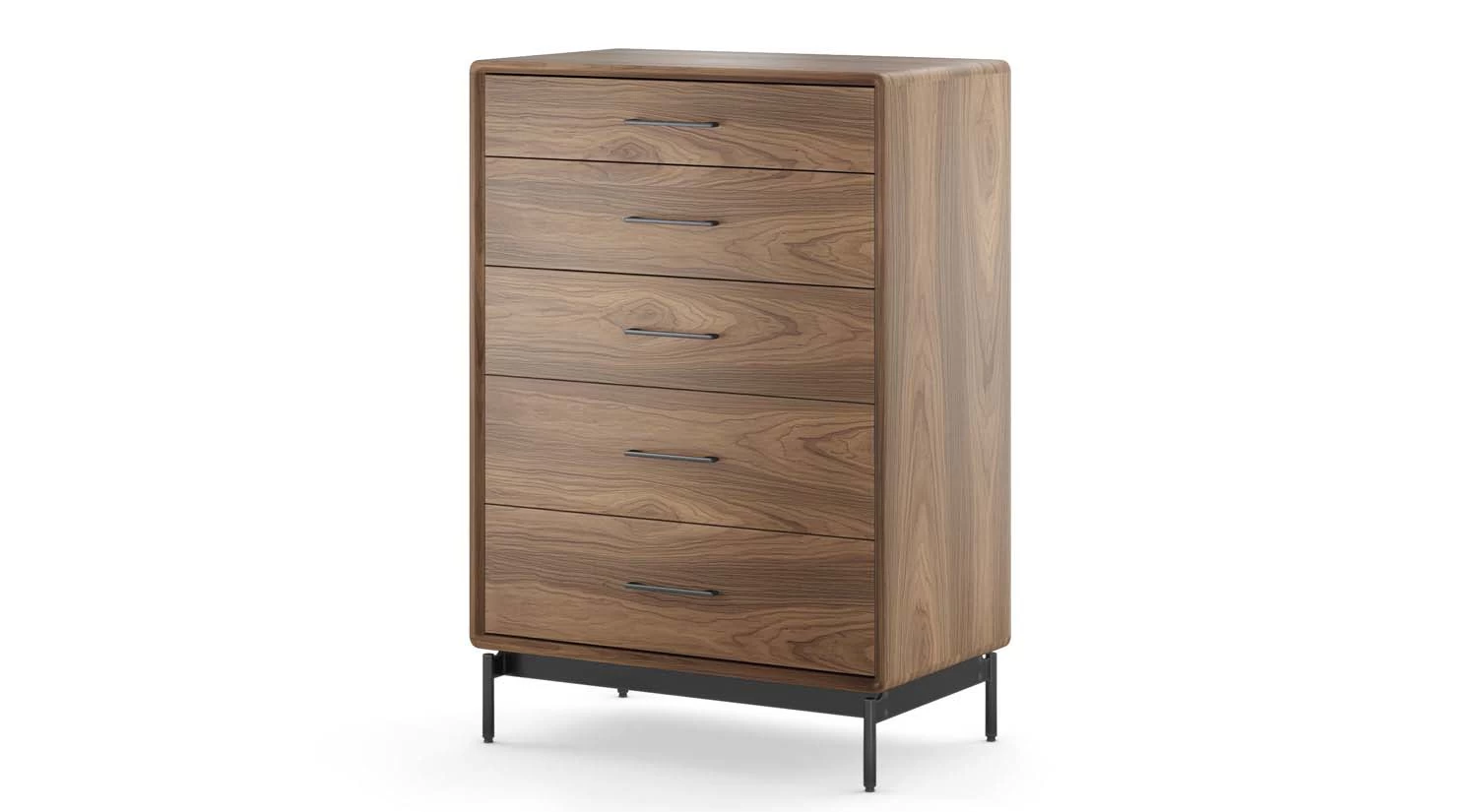 The Linq 5 Drawer Chest stands tall and sturdy, showing off a modern design that’s both practical and attractive. Each drawer opens up one at a time and offers ample space so you can keep your clothing organized and easily find what you need while getting ready. Features like sleek handles and smooth, rounded edges give this chest an understated elegance that goes beautifully in any bedroom.