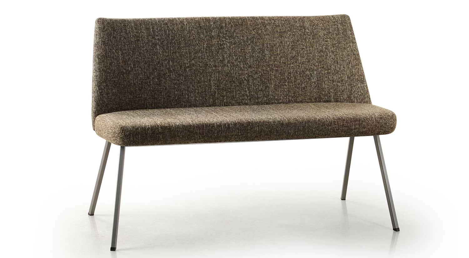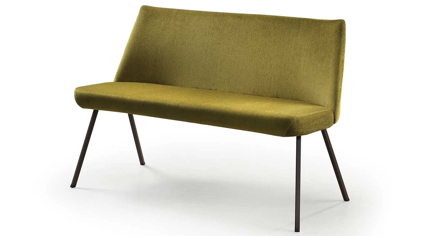 The Lola bench is available in a wide selection of fabrics and has a modern metal flare leg. The Lola is also available with buttons added across the back for a small upcharge.