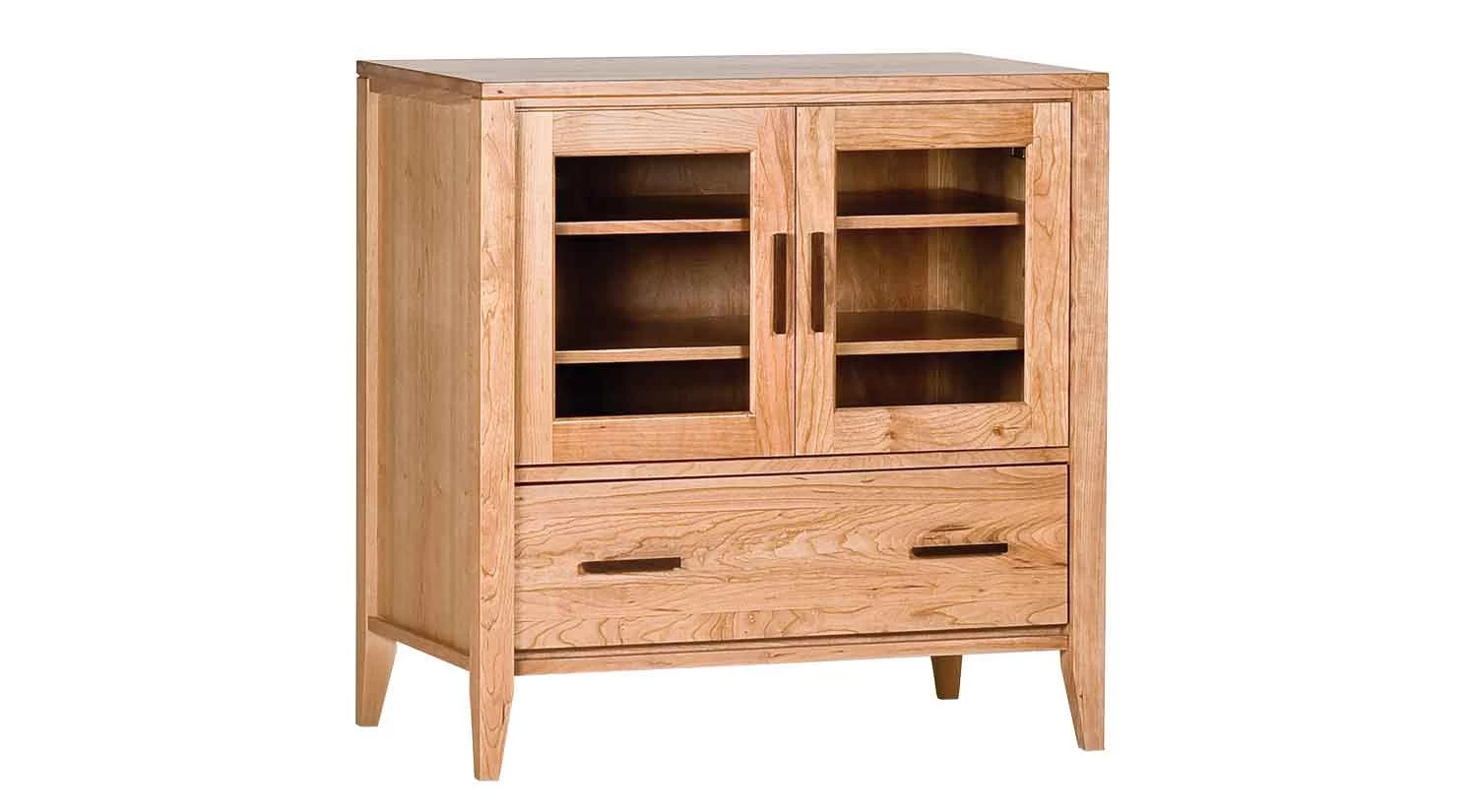 The Luna Media collection is made from solid cherry wood with walnut stained handles. The glass doors come with soft close hinges and the drawers are constructed with french dovetail joinery and full extension glides. Available in Natural Cherry, Autumn Cherry, and Chocolate Cherry.
