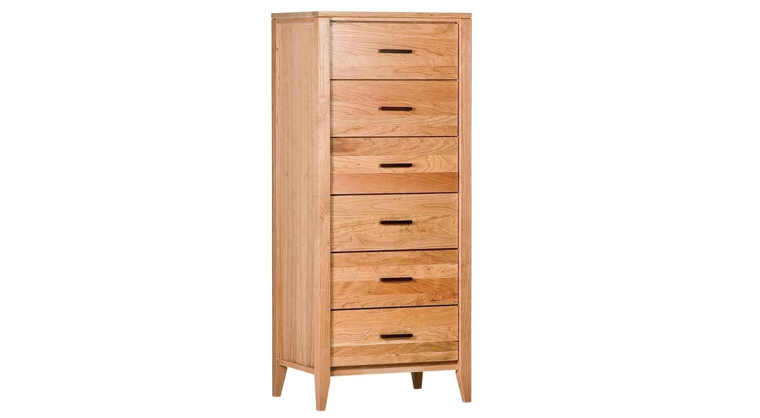 The Luna Collection from Woodforms is classic with a modern edge. Made in Massachusetts, its clean angles and bold lines create an attractive look for any bedroom. The drawers have walnut stained handles, full extension glides, and are constructed with French sliding dovetails. Available in Natural Cherry, Autumn Cherry, and Chocolate Cherry.