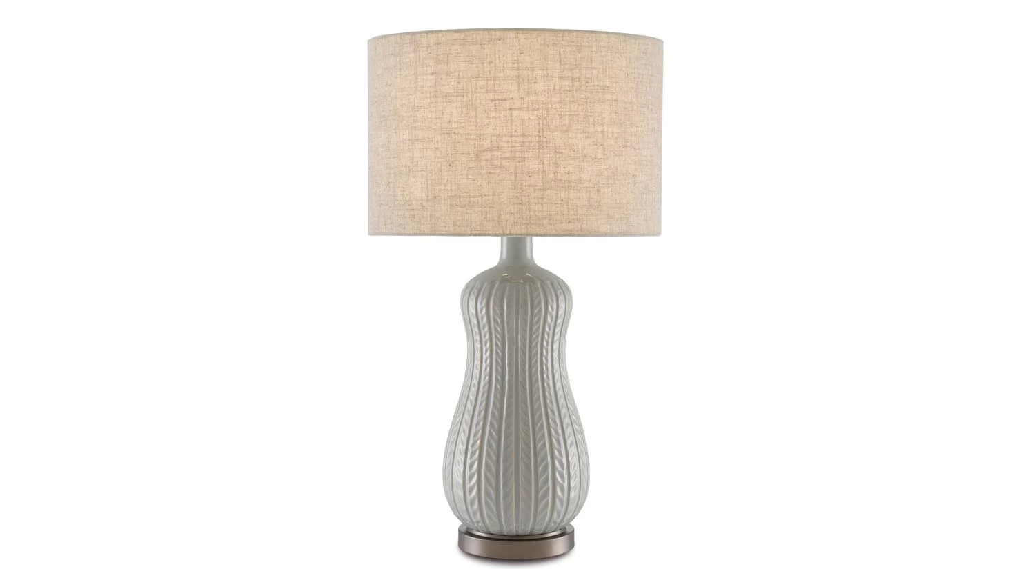 The Mamora Pale Table Lamp has an organic feel, complete with a neutral palette and linen shade. Its knit-like appearance adds texture and intrigue as it sits on a sleek metal base.