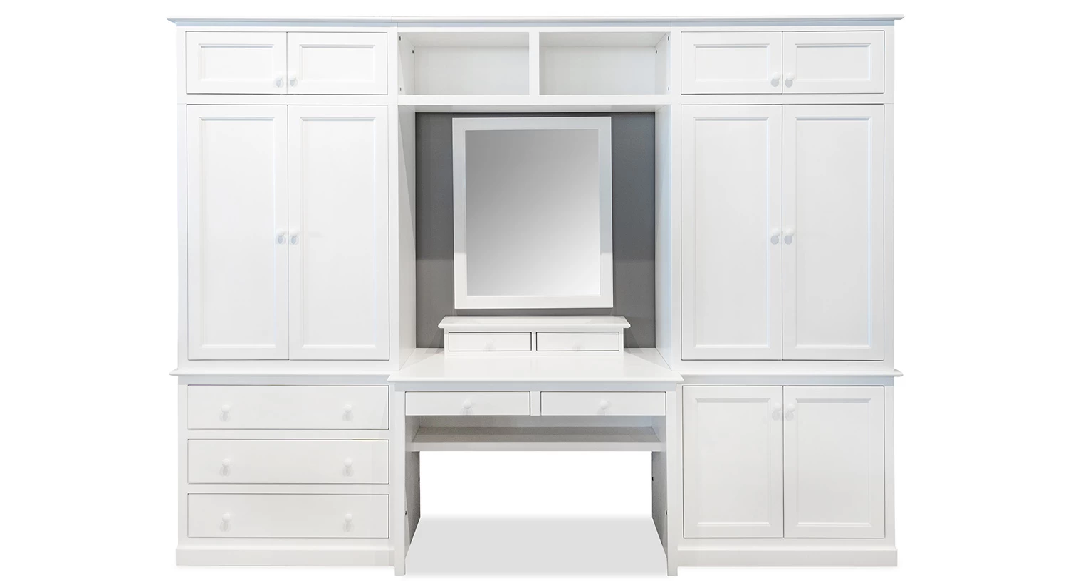 The Manchester Bedroom Wall Unit by Revolution provides vast amounts of storage with a lovely vanity area built in. Made in New Hampshire, this collection is completely customizable to your needs.