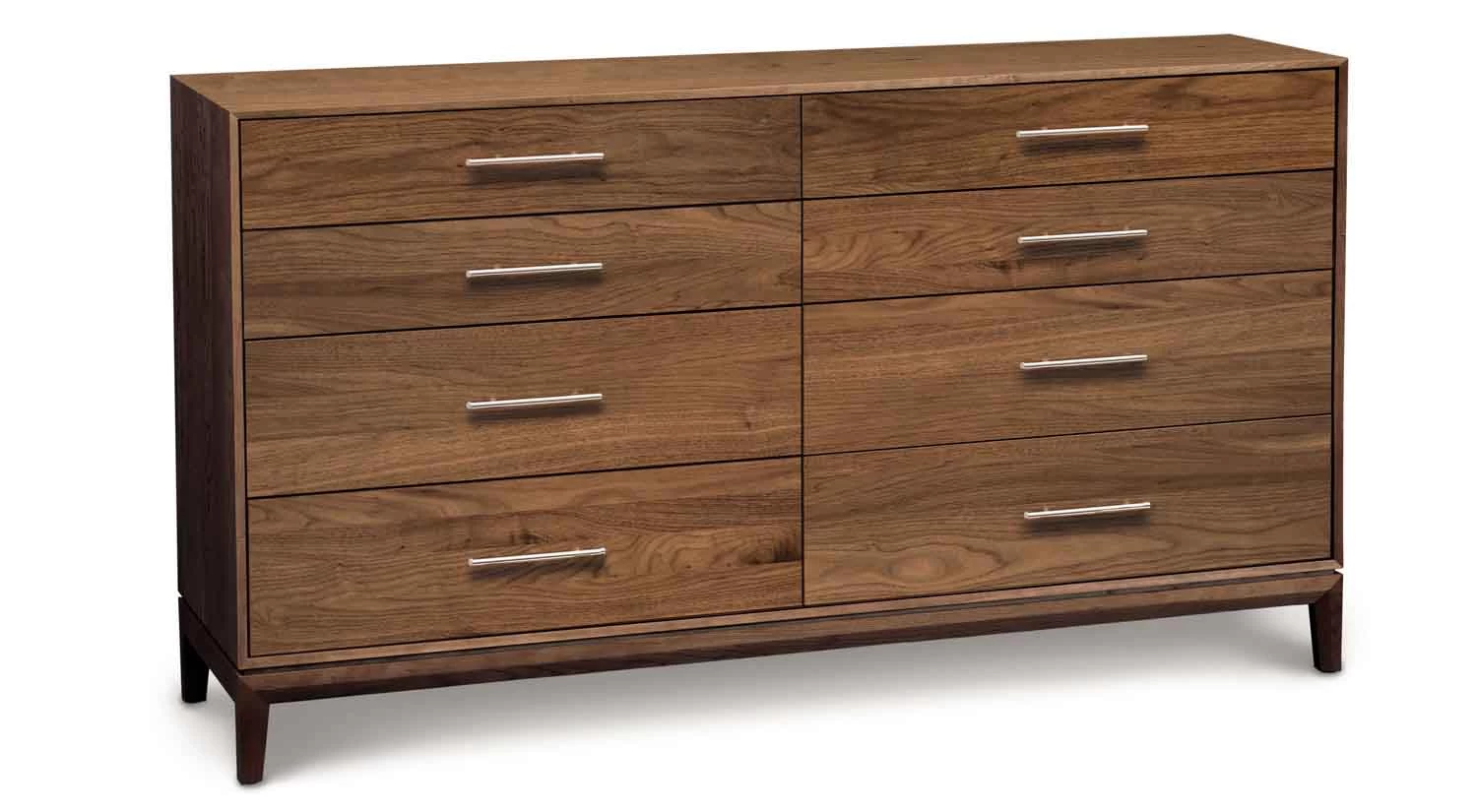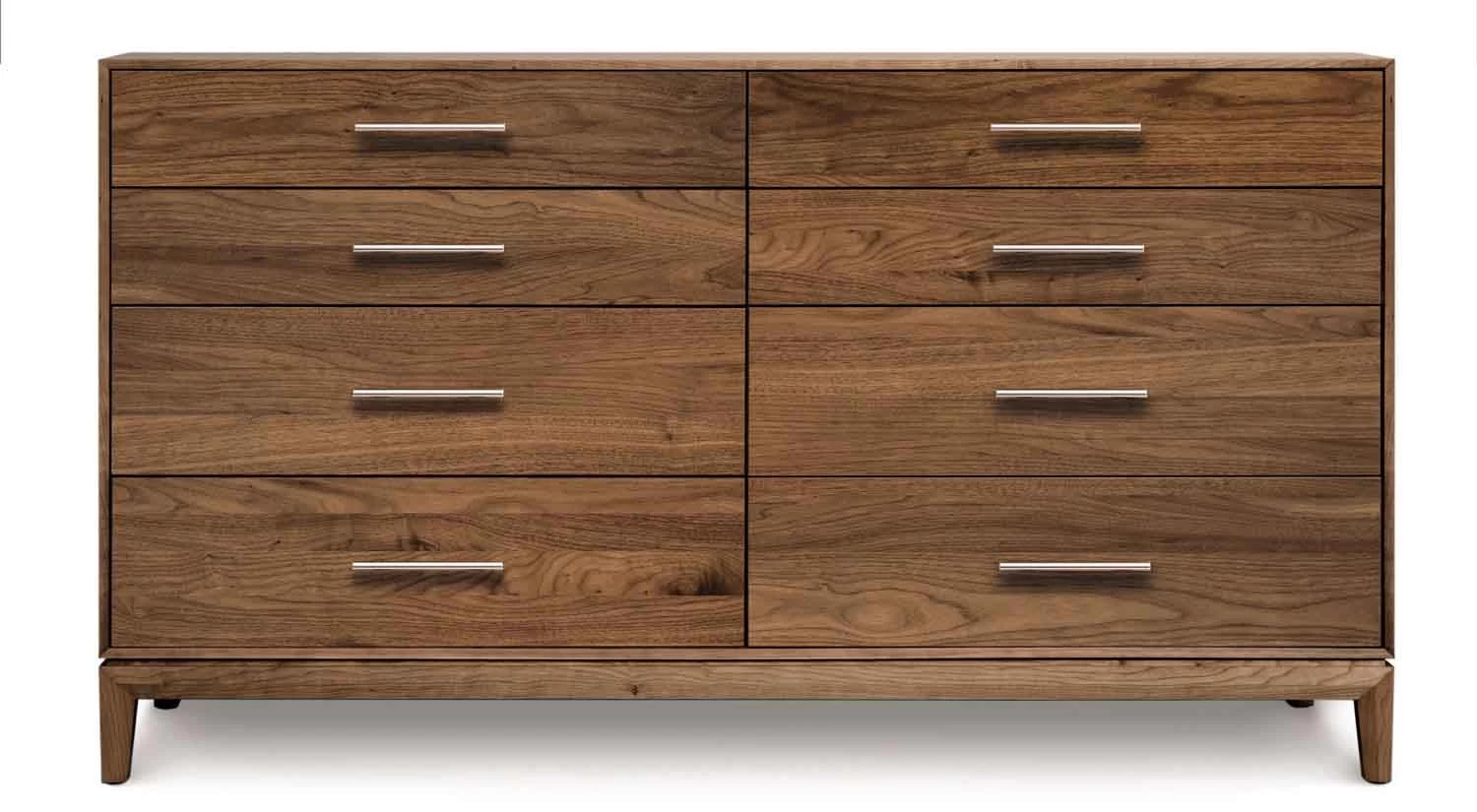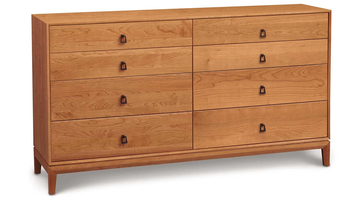 The Mansfield Collection from Copeland offers a sophisticated look with contemporary lines. Made from solid cherry or walnut hardwood in Vermont, it has soft close drawers with optional black bronze pulls on cherry wood case and long nickle bar pulls on walnut cases.