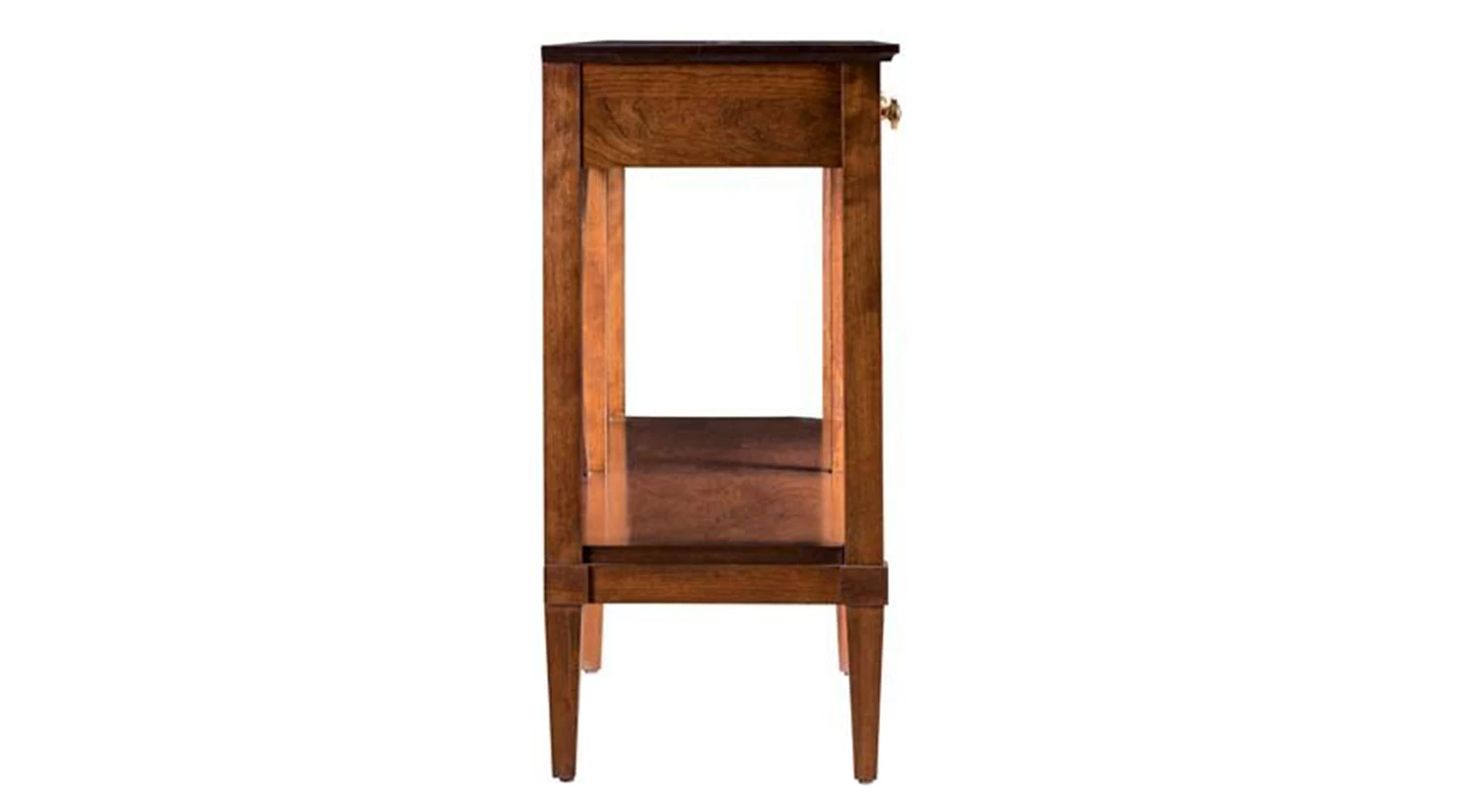 The beautiful Monaco Console from Gat Creek is readily placed behind a sofa or an entry hall or foyer in a highly decorative and functional role. Four-sided tapered feet gracefully finish the legs below the bottom shelf. Double x-braces. Handmade in West Virginia. It’s available in many finishes and paints and is made with local and sustainably-harvested solid Appalachian hardwood.