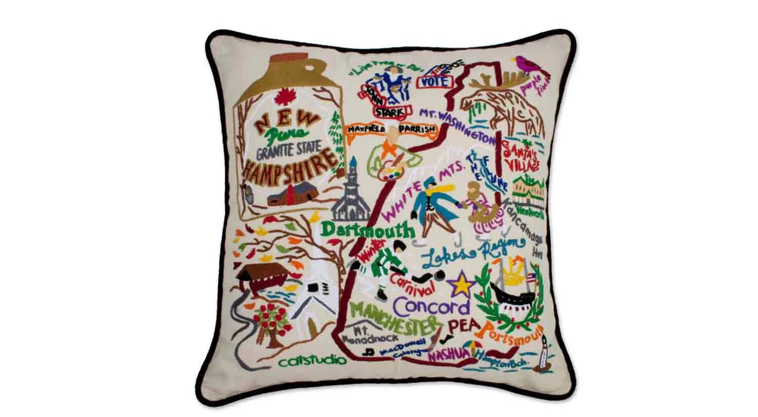 The New Hampshire Hand-Embroidered Pillow is a colorful accessory for any living space. Whether as a gift or part of your own home decor, it’s a fun celebration of New England charm.