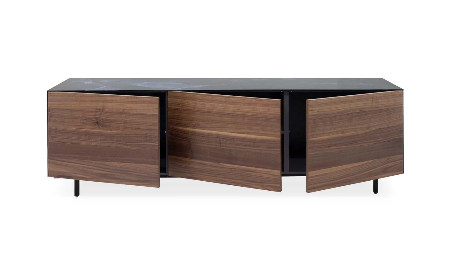 Shown in Lumini glass, Venkel Soft Nogal wood finish, and Matt Black legs.