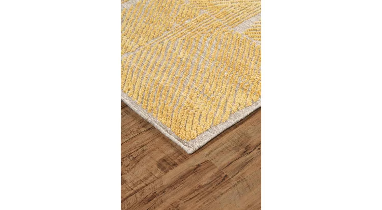 The Norah Gold Rug brings a striking look to modern spaces yet remains resilient against foot traffic. A three-dimensional design gives the rug texture while its warm color scheme features a vibrant shade of gold.