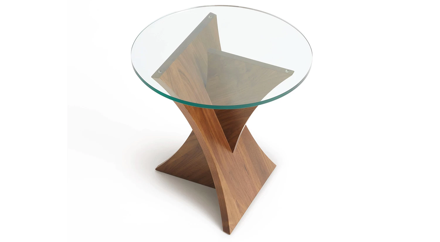The Planes Round End Table steps outside traditional furniture styles. It features two joining planes that form a solid walnut wood base topped by 15mm of tempered glass. This table will look good on either end of your sofa or next to your favorite recliner.
