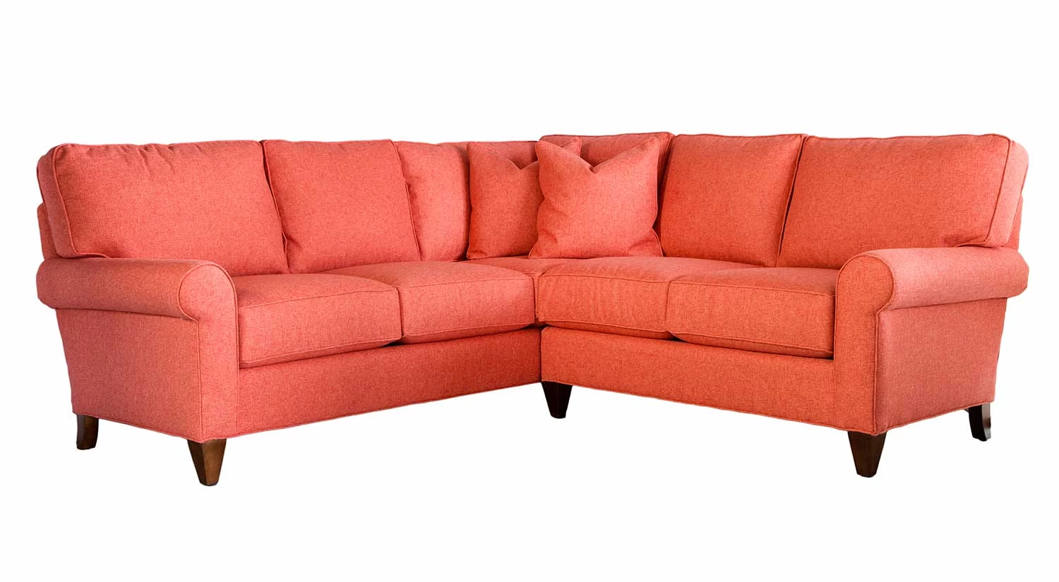 The graceful Portside collection has a rolled arm, T-back cushions and a tapered foot. We love pairing the sofa with our Chilton chair for that perfect vignette. The Portside sectional comes with two toss pillows.
