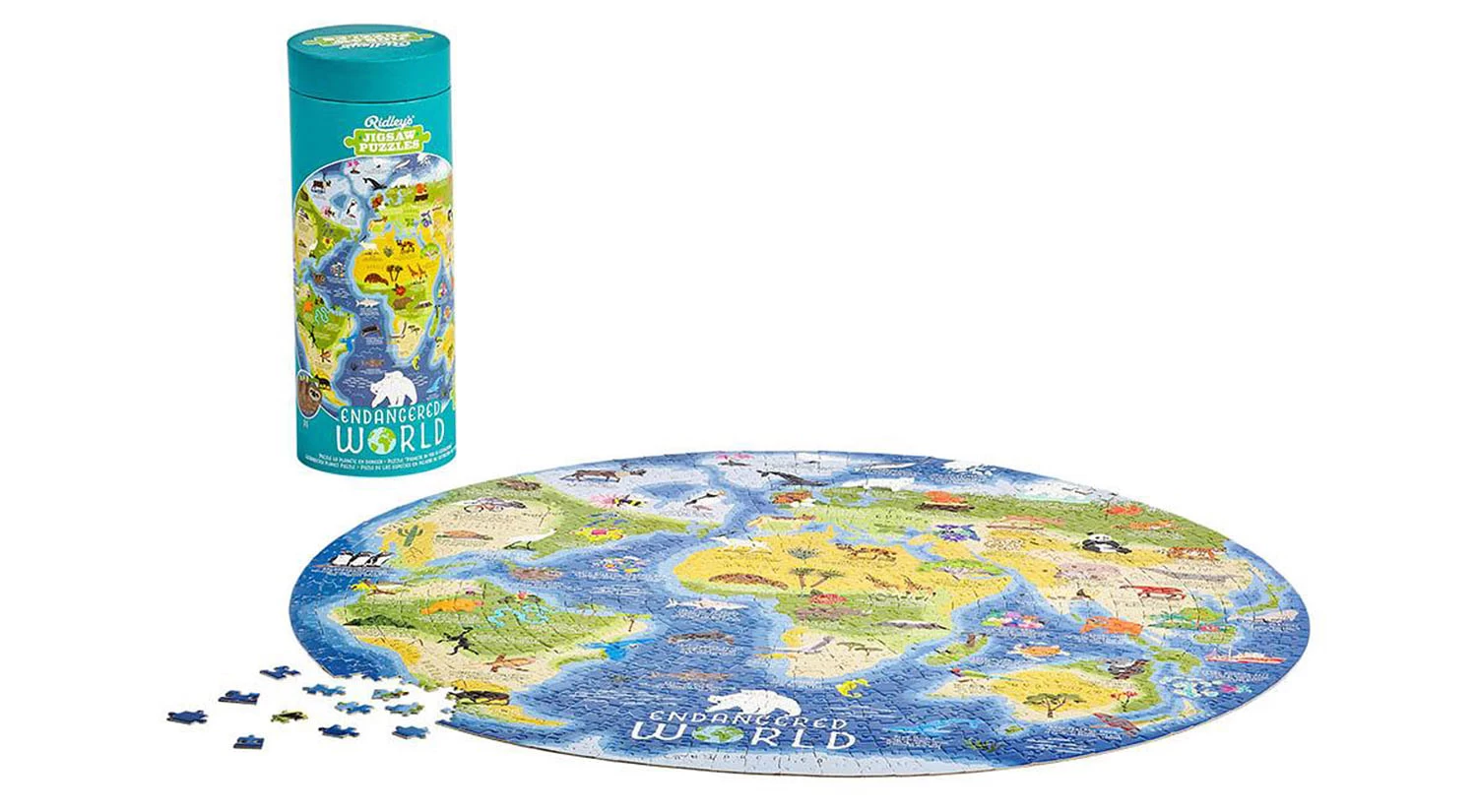 This beautifully illustrated 1000-piece circular Endangered World Jigsaw Puzzle from Ridley’s Games features the world’s most endangered species and the threats they face in their habitats. From the Polar Bear and the lesser known Addax to the Puffin and the North Atlantic Garbage Patch, discover over thirty animals and environments at risk from across the globe.