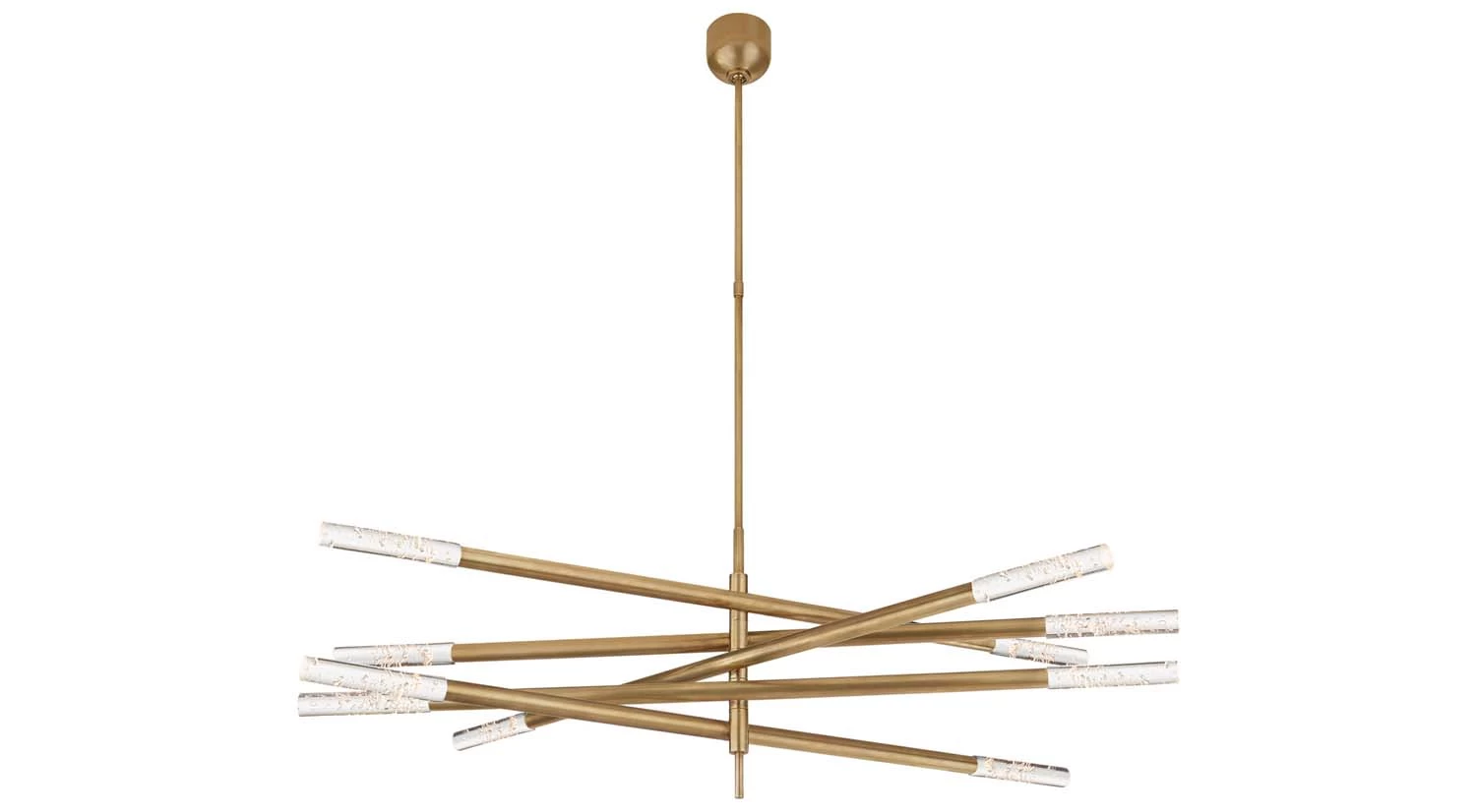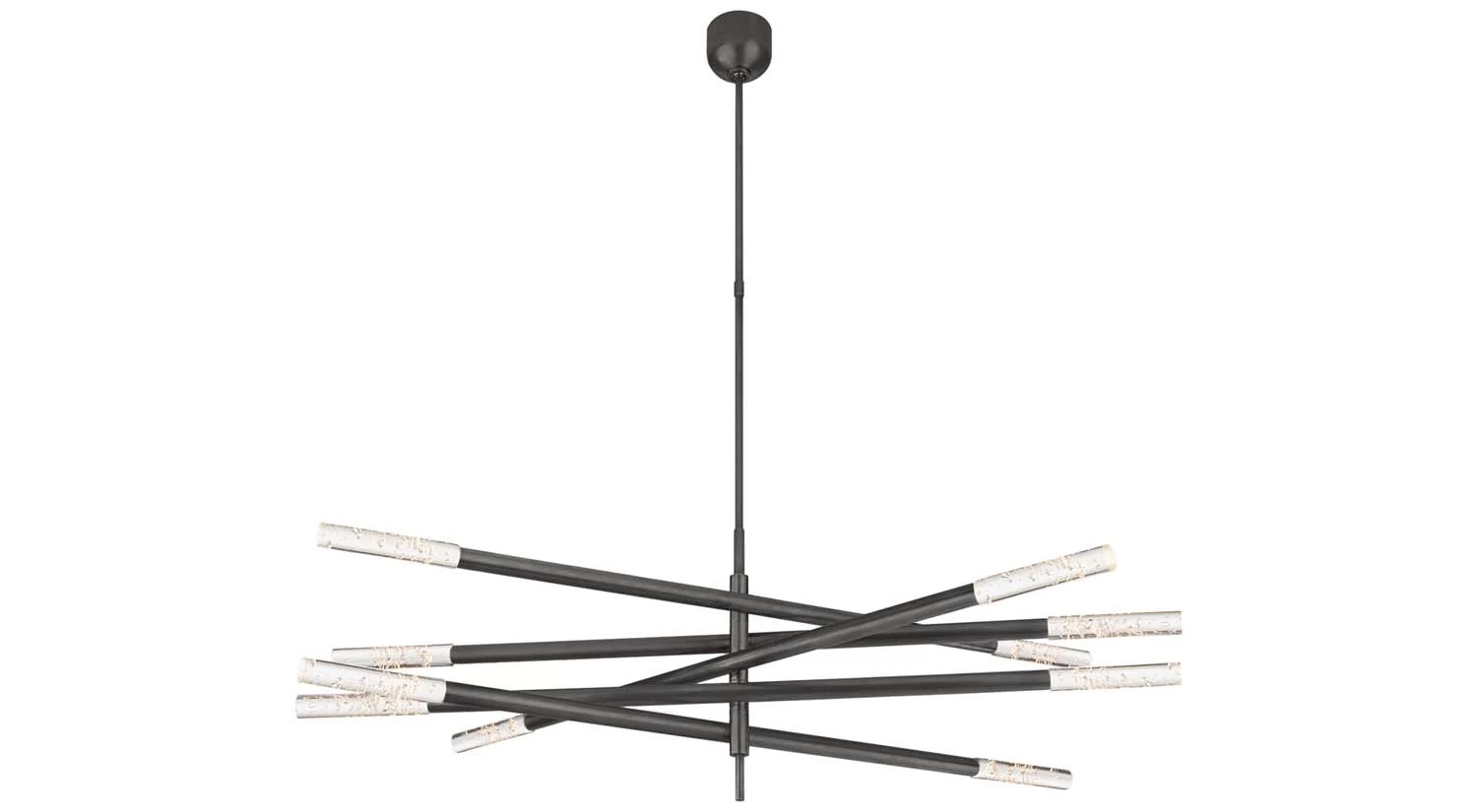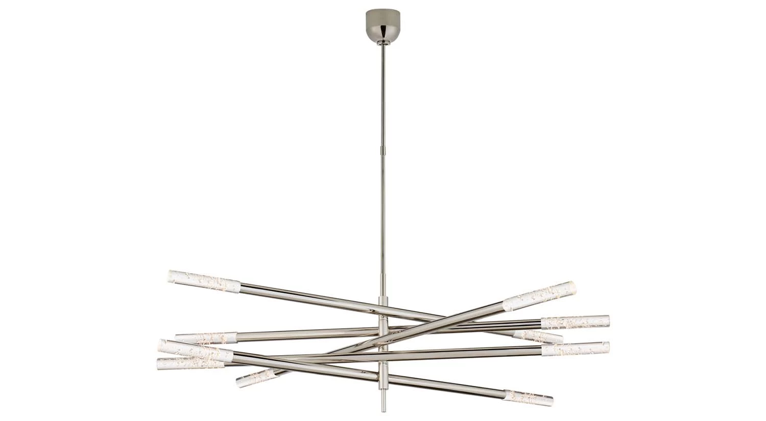 Designed with elegance, the Rousseau Grande Ten Light Chandelier is a striking fixture for the kitchen, dining area, or living room. Ten slender arms are staggered in different directions, giving way to seeded glass for texture and creating intrigue from any angle.
