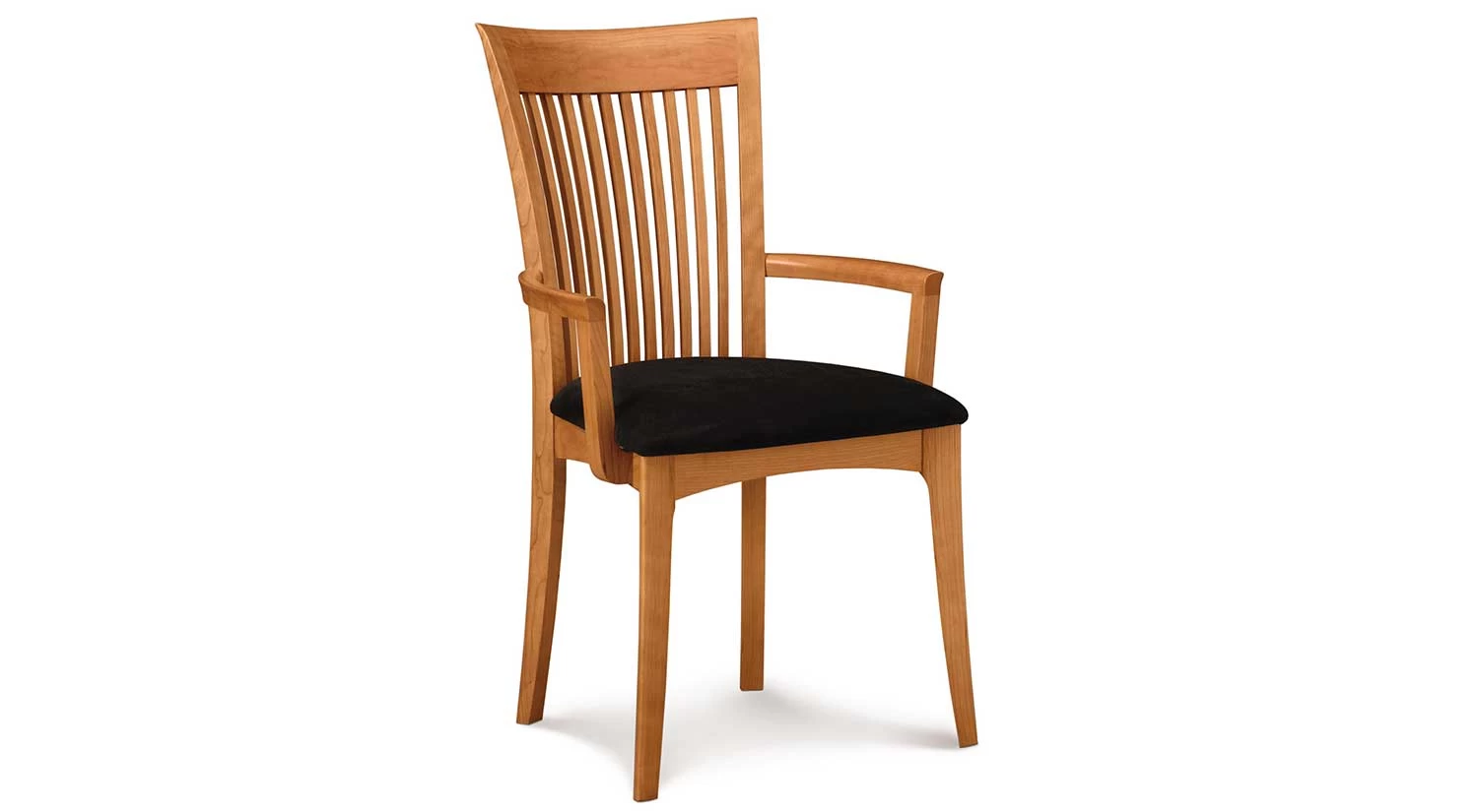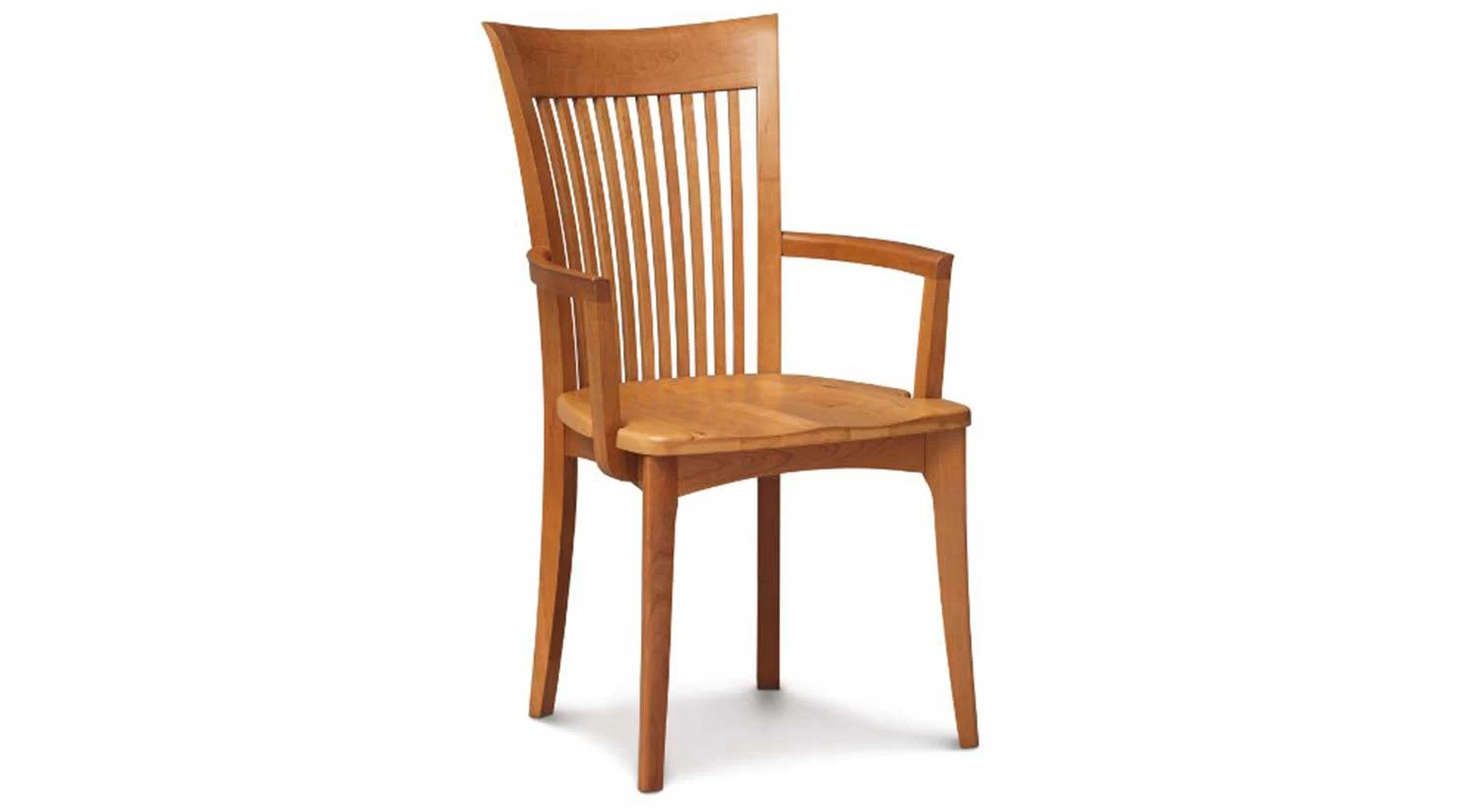 The Sarah arm chair is made of cherry wood and available in natural or a variety of finish options. Choose from an upholstered or wood seat.