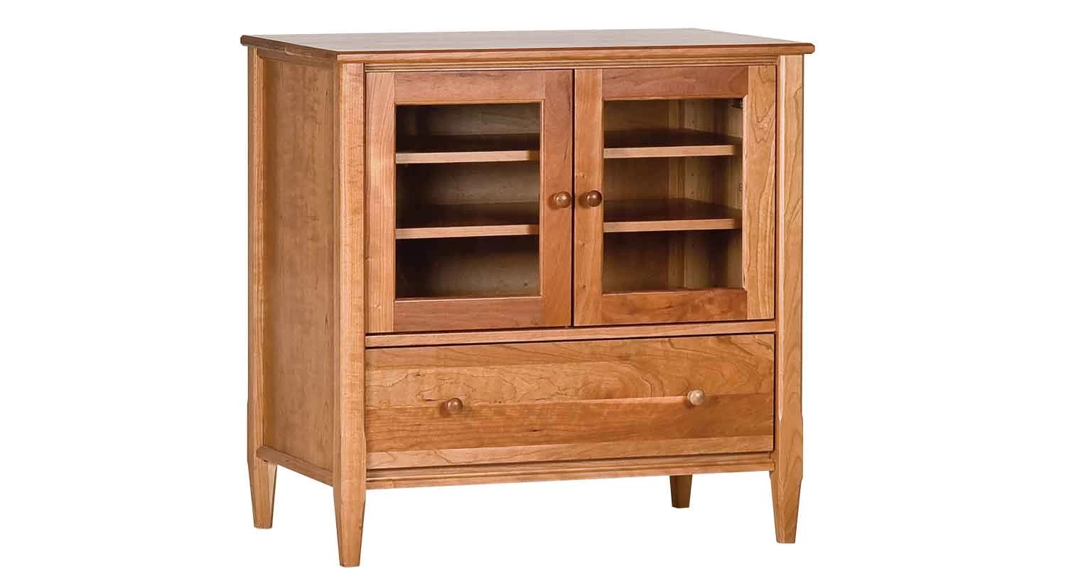 The Shaker Media collection is an attractive and practical solution to housing your TV and components. The glass doors come with soft close hinges and the drawers are constructed with french dovetail joinery. The drawers have full extension ball bearing sliders which offer full access to the rear of the drawer. Available in Natural Cherry, Autumn Cherry, and Chocolate Cherry.