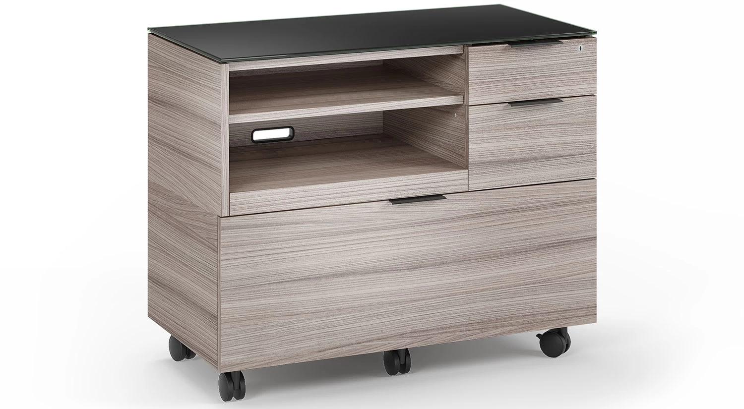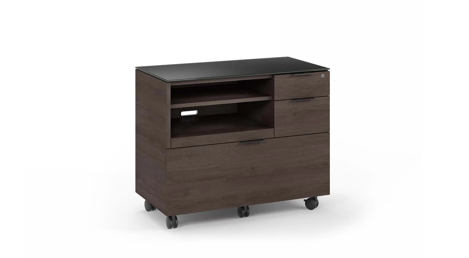 The Sigma Multifunction Cabinet helps achieve an organized workspace so you can remain productive throughout your day. It features three drawers, one for filing and two for storage, in addition to a printer tray, locking wheels, and an adjustable shelf. With a sleek, tempered glass top, this file cabinet can stand on its own or with the Sigma Desk for a seamless look.