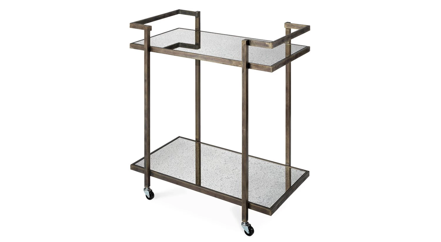 The Tanner Bar Cart is inspired by a 1930’s factory trolley with two roomy shelves in antiqued mirror. Good for cocktails or a brunch buffet.