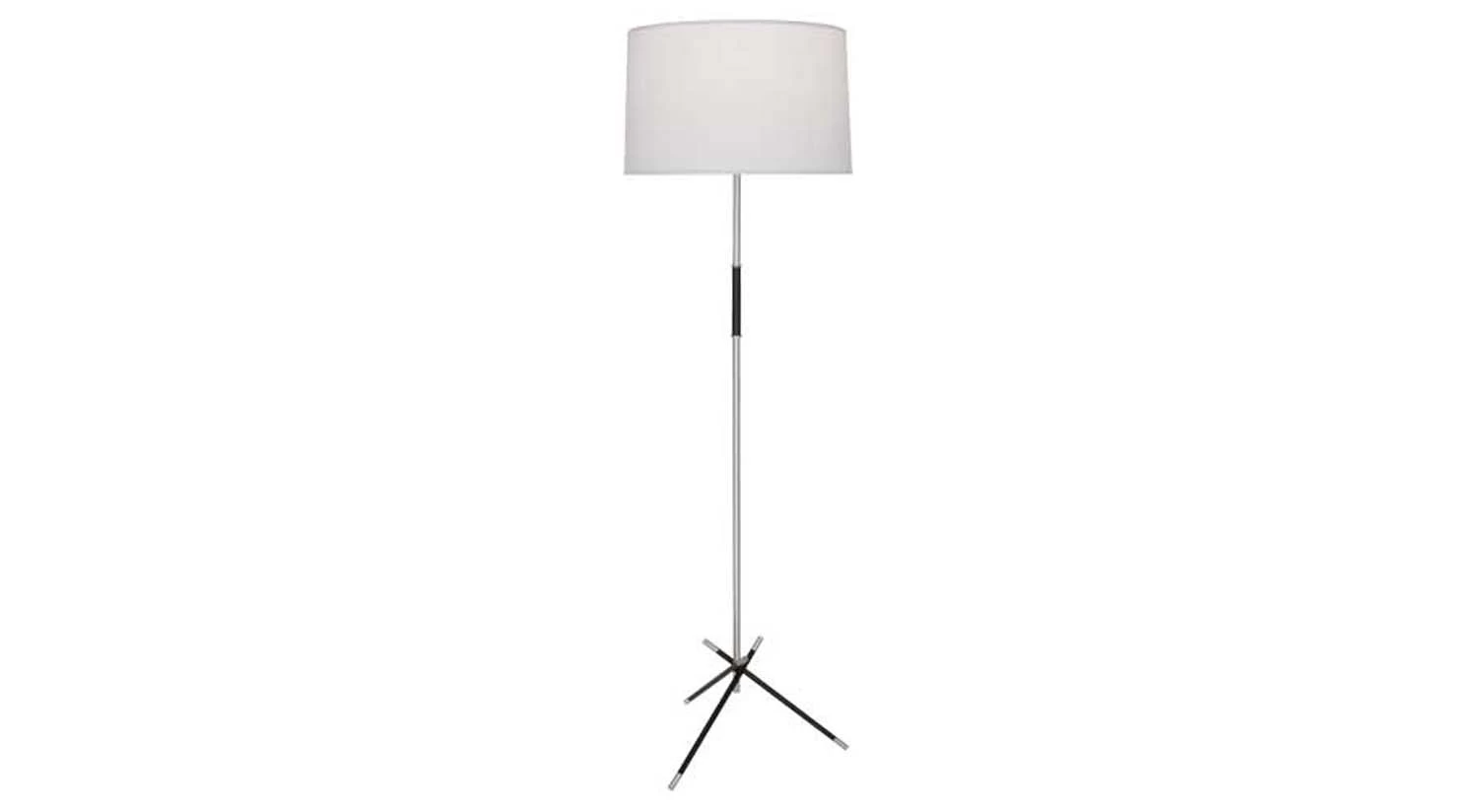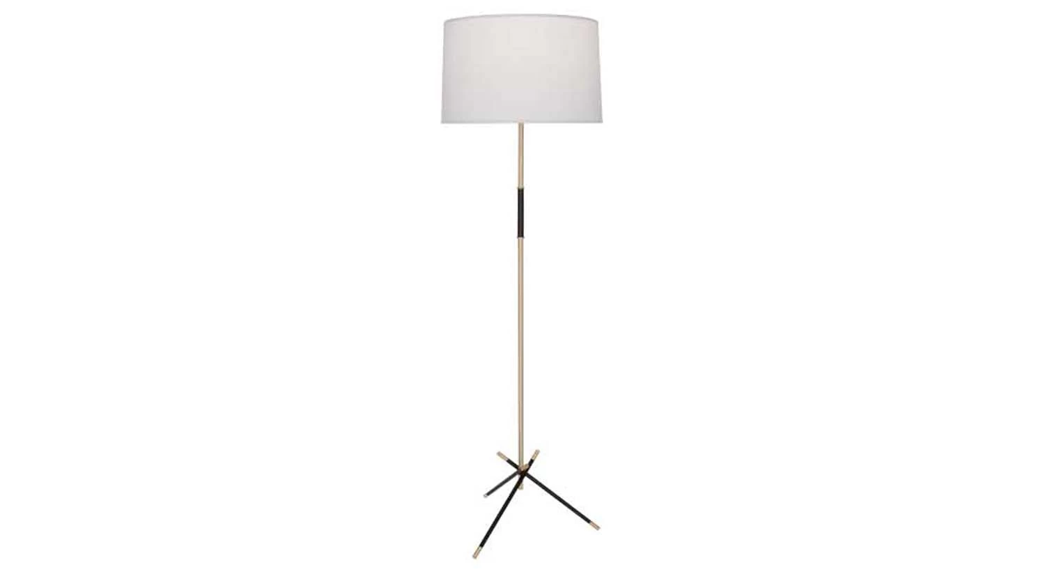 The Thatcher Floor Lamp is sleek and sophisticated, supported by a cross-legged base and topped with a linen shade. Black accents complement this modern lamp’s brass finish to highlight its elegance.