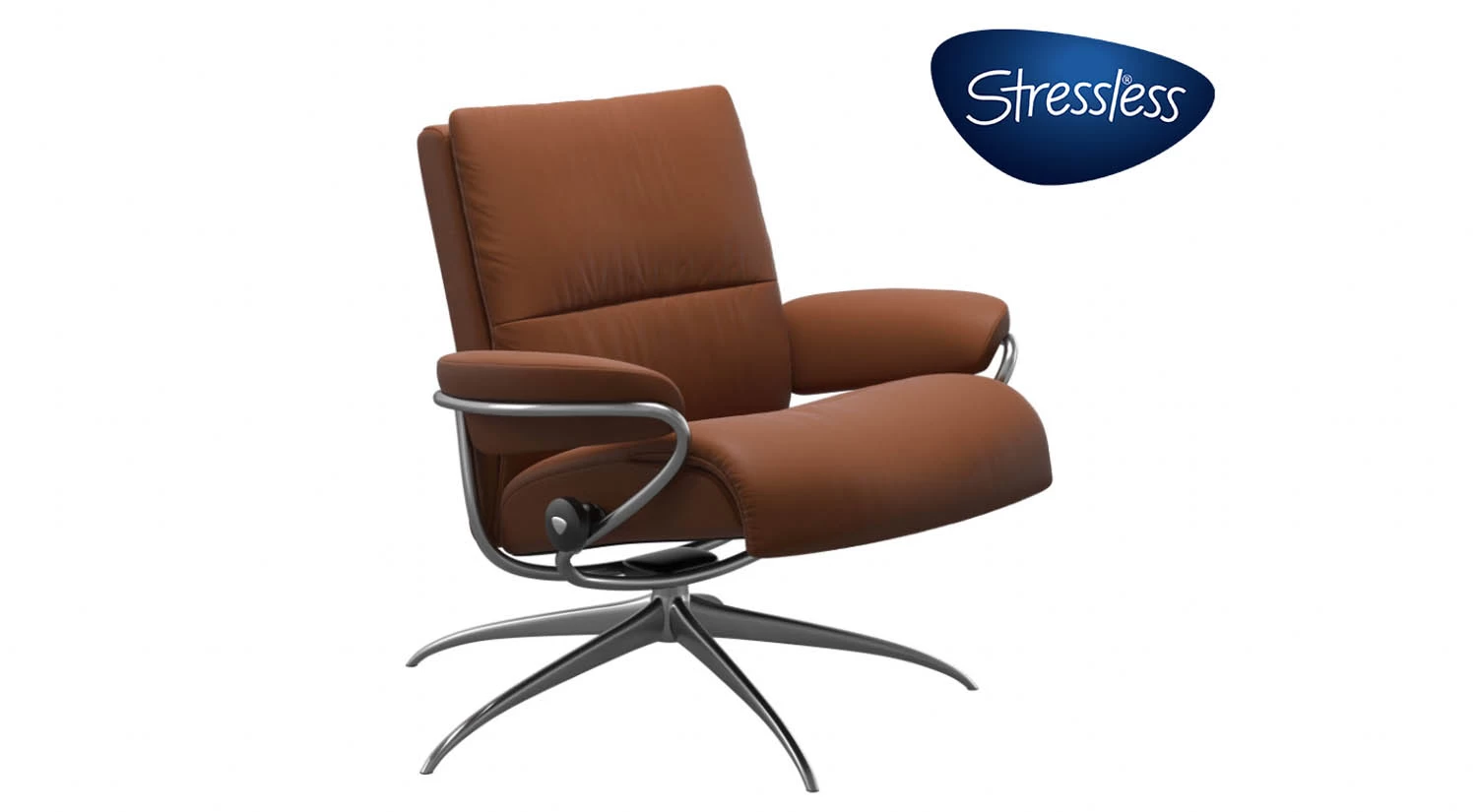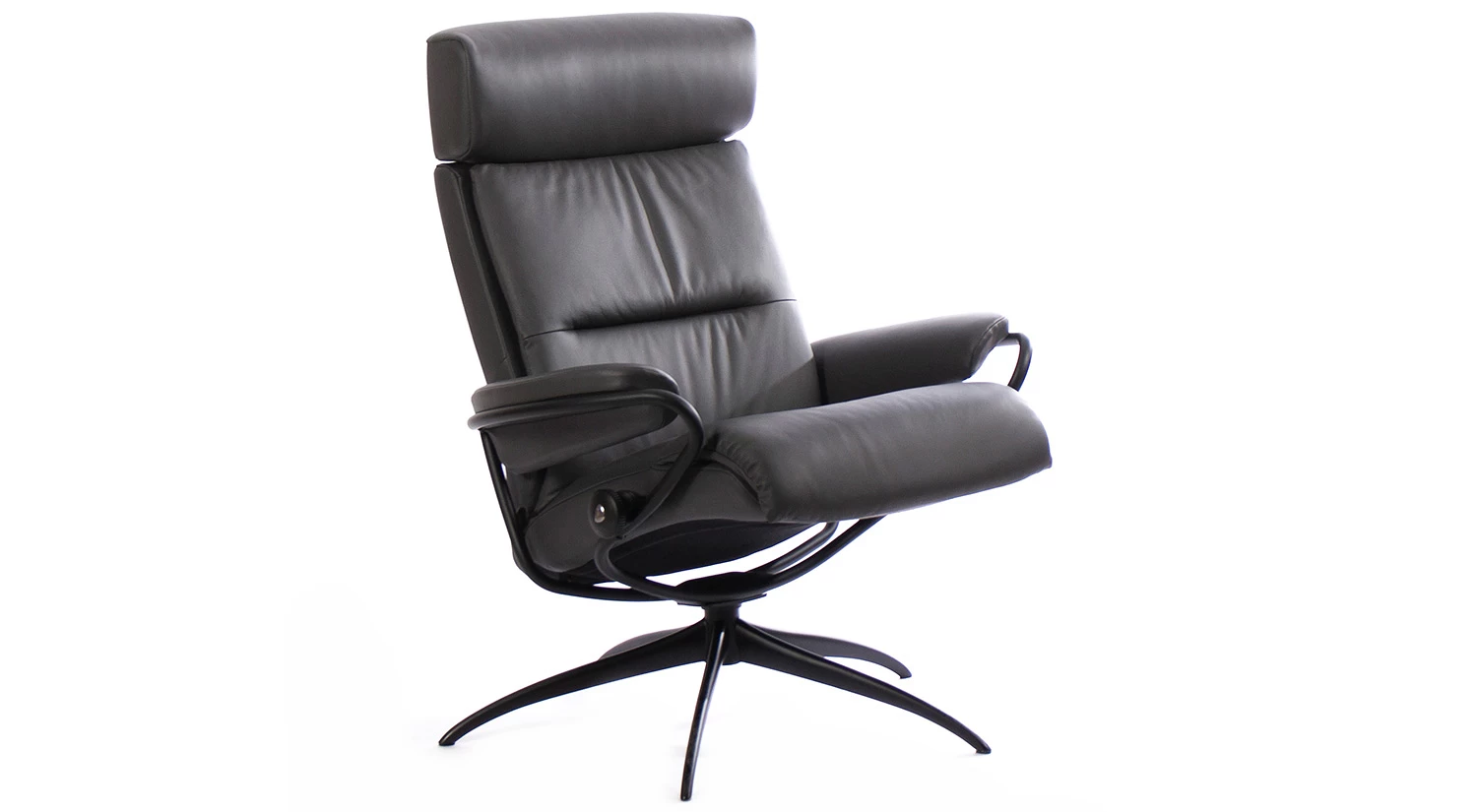 The Tokyo Stressless Recliner features a slim back, star base, and an optional adjustable headrest. Each chair uses the BalanceAdapt system, which enables a swivel, rock, and recline motion.