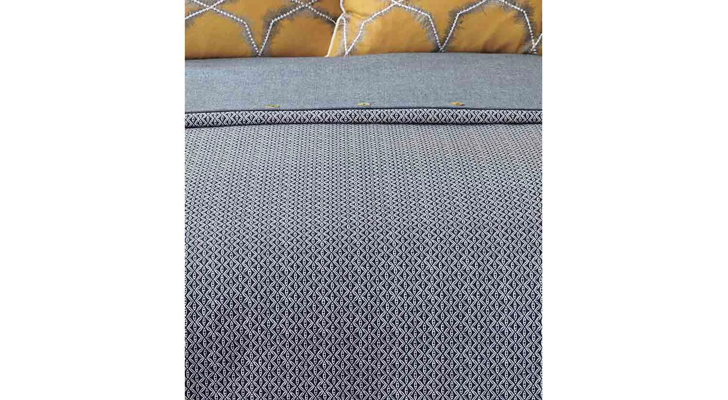 The Tucker Duvet Cover features a distinct ogee pattern in blue, showing sophistication and style yet bringing a fresh look to the bedroom.