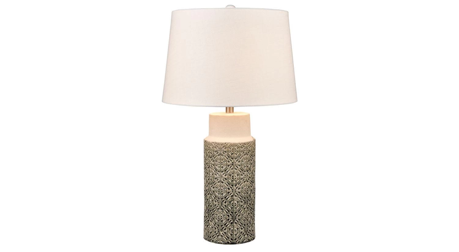 The Tula Table Lamp is ideal for a coastal or updated traditional style living room, bedroom or hallway. Made from earthenware, this 1-bulb design features a white finish with its textural pattern highlighted in grey. Its soft, organic tones are topped with a round hardback shade in off white, textured linen.
